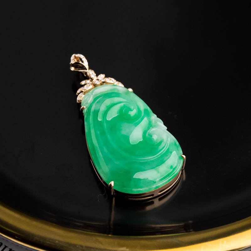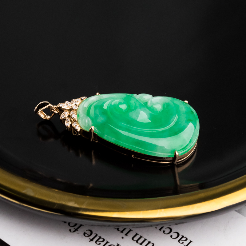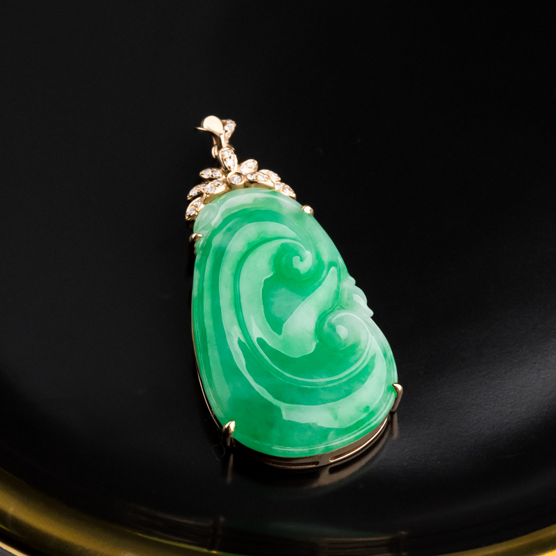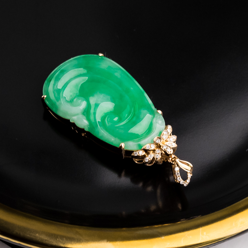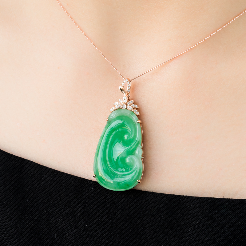• 18K糯冰种苹果绿翡翠如意吊坠