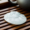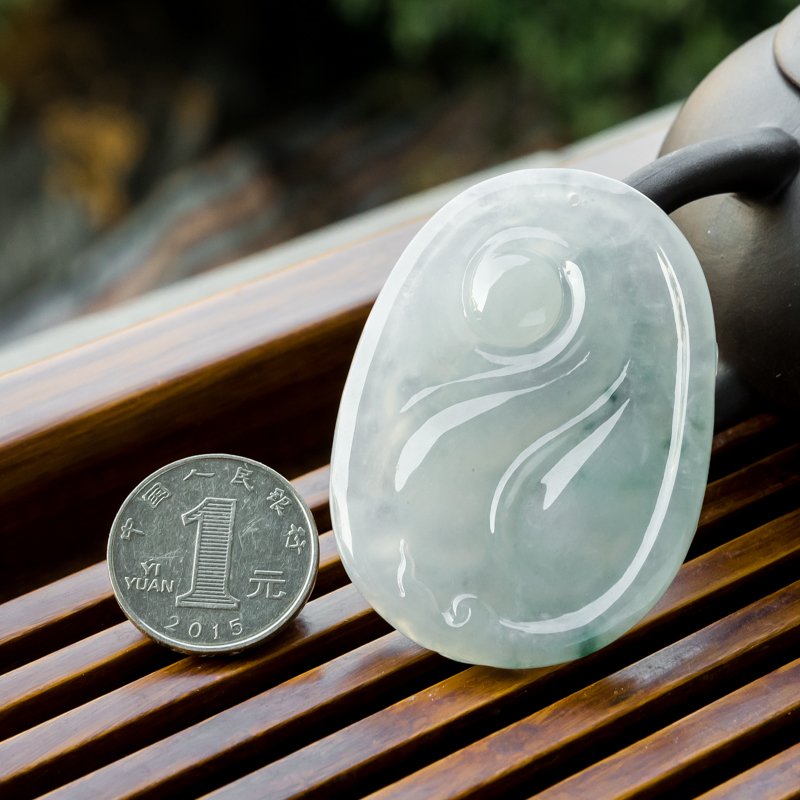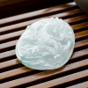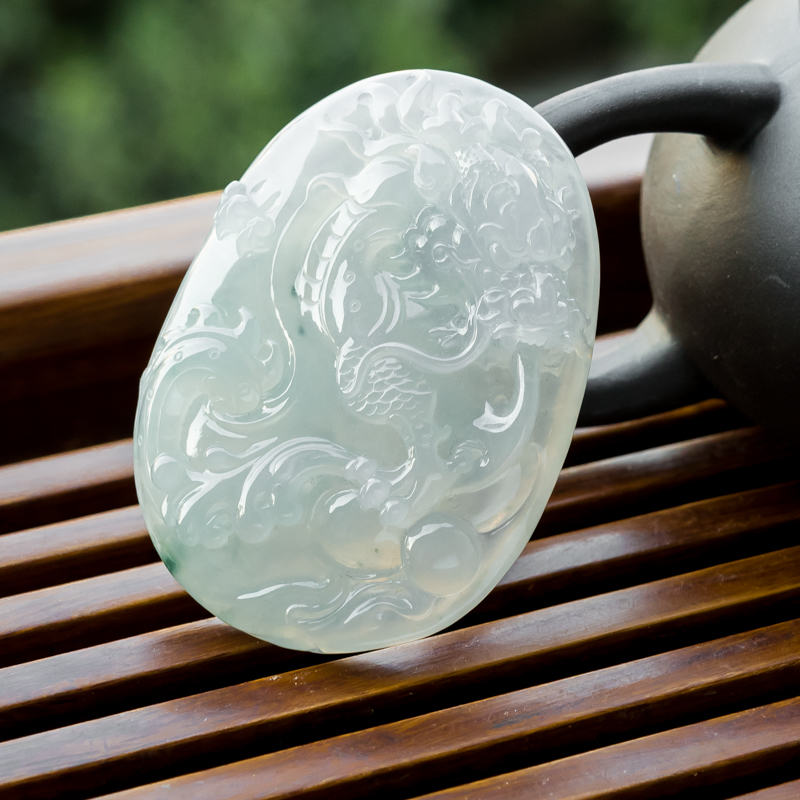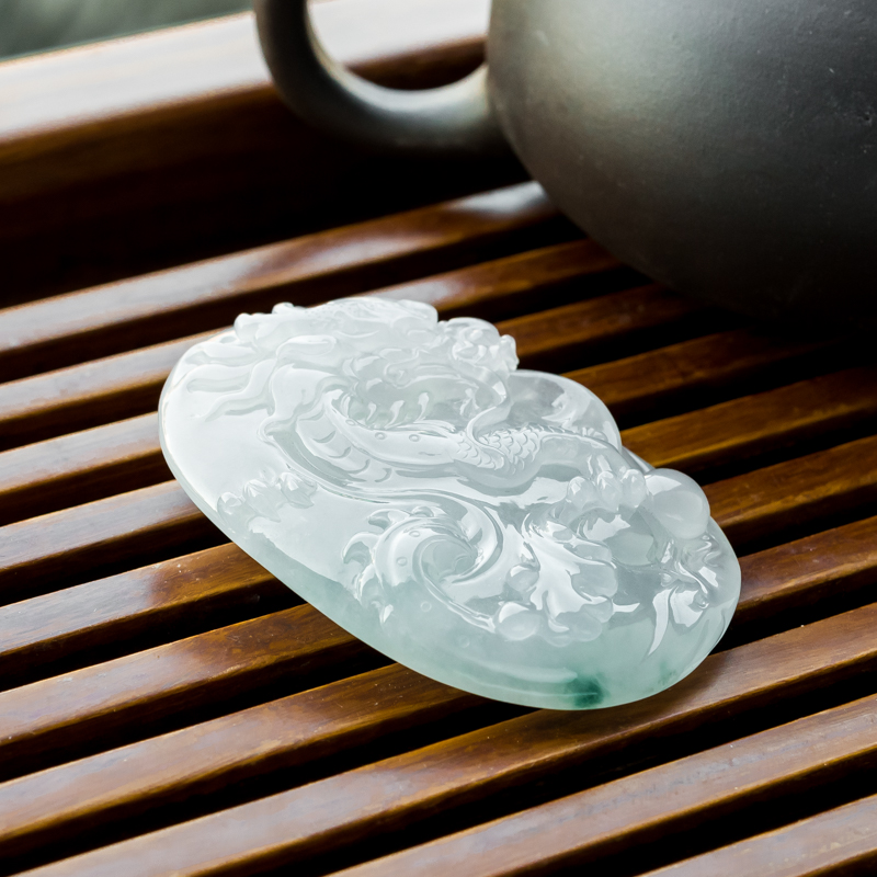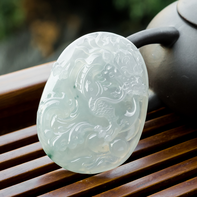 • 糯冰种飘花翡翠神龙戏珠吊坠