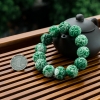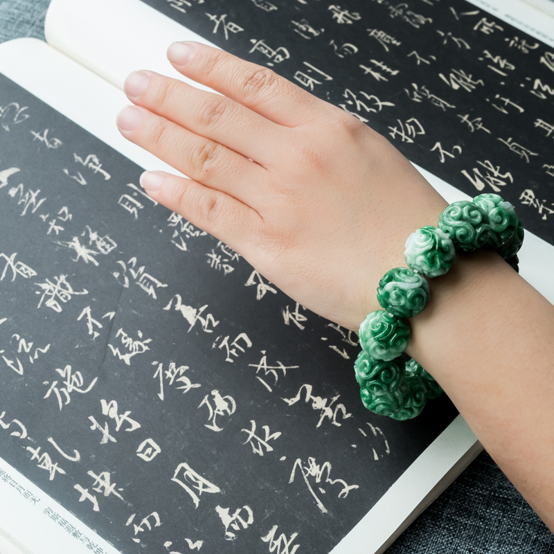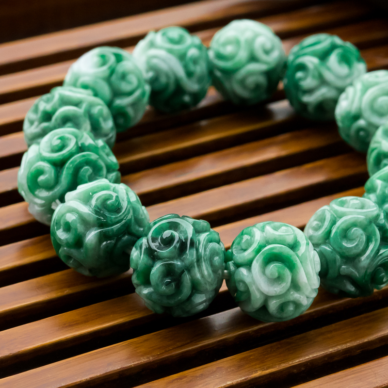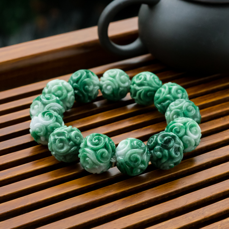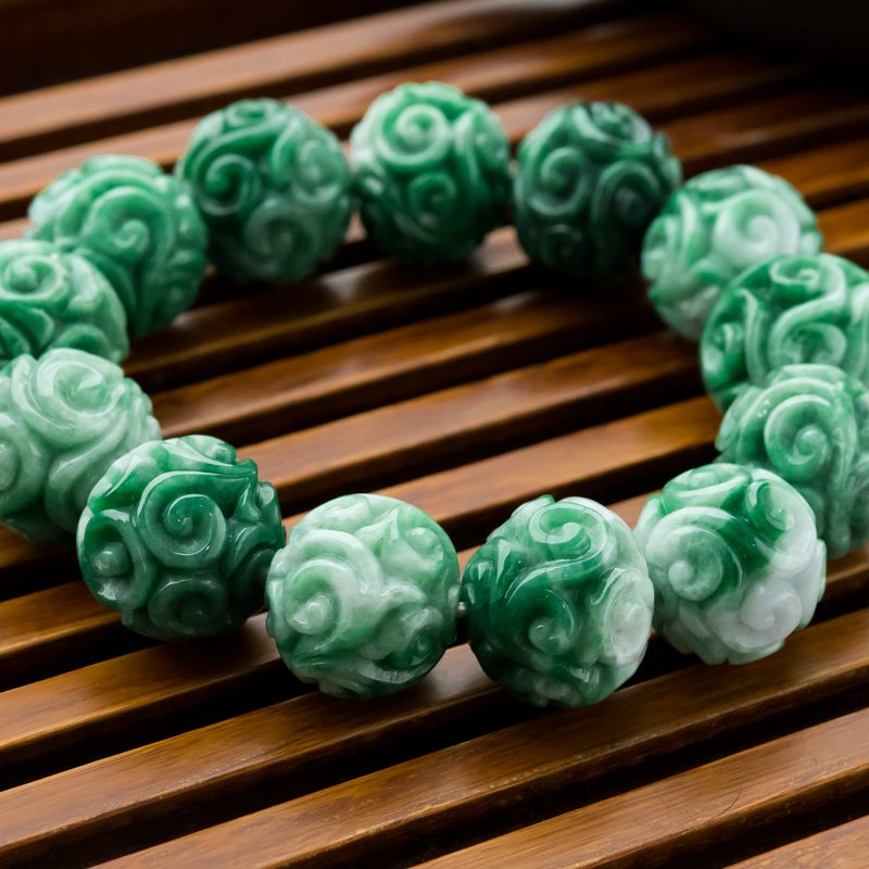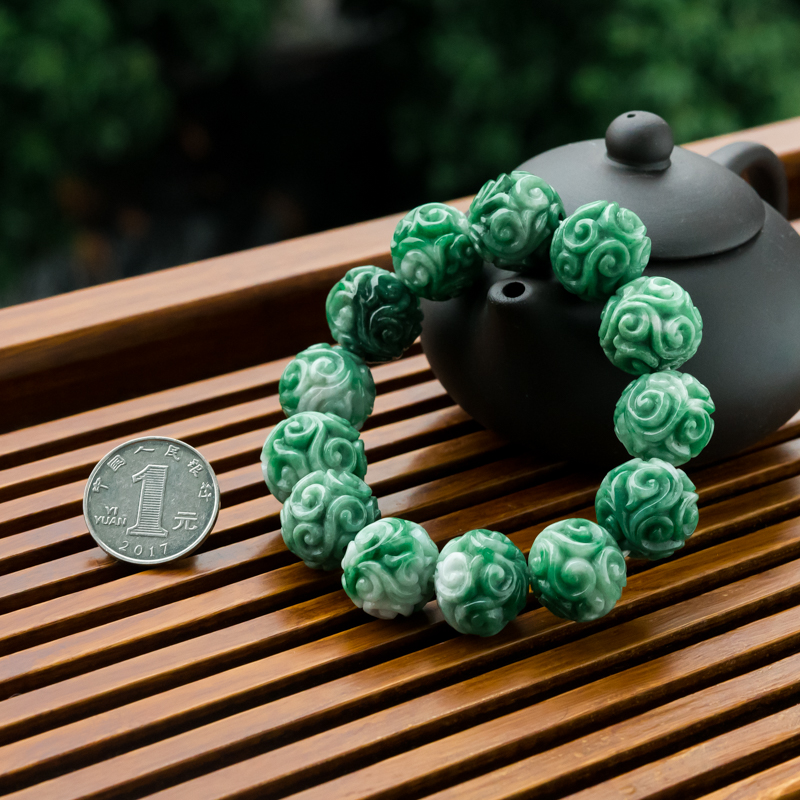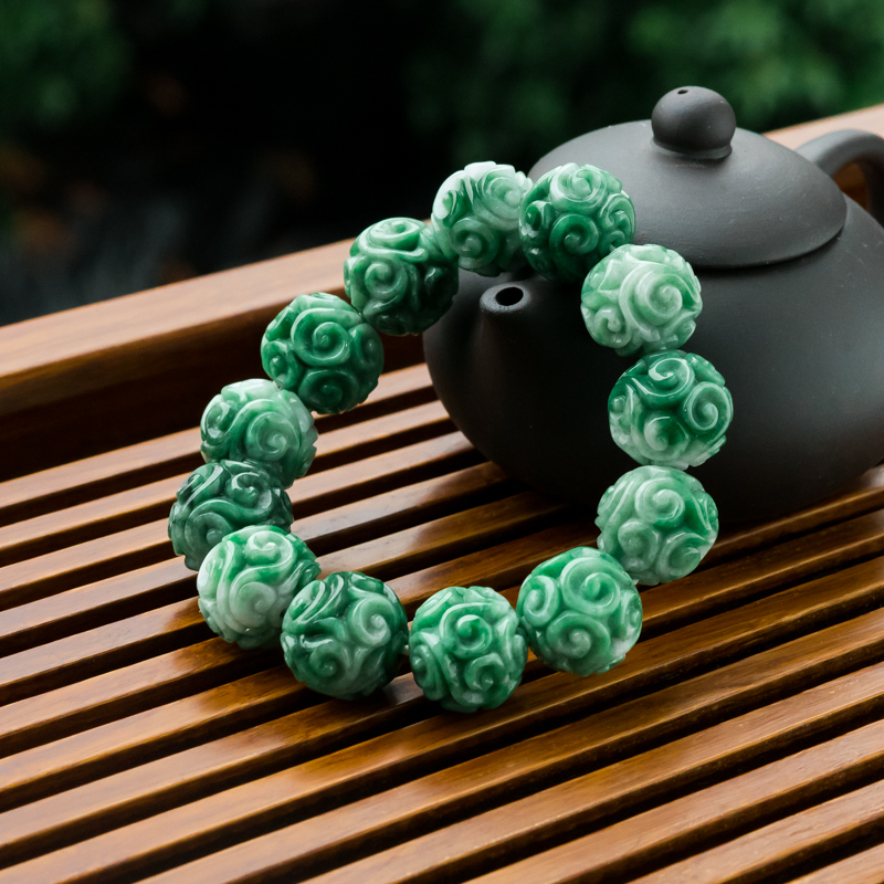 • 糯冰种深绿翡翠缠枝纹单圈手串
