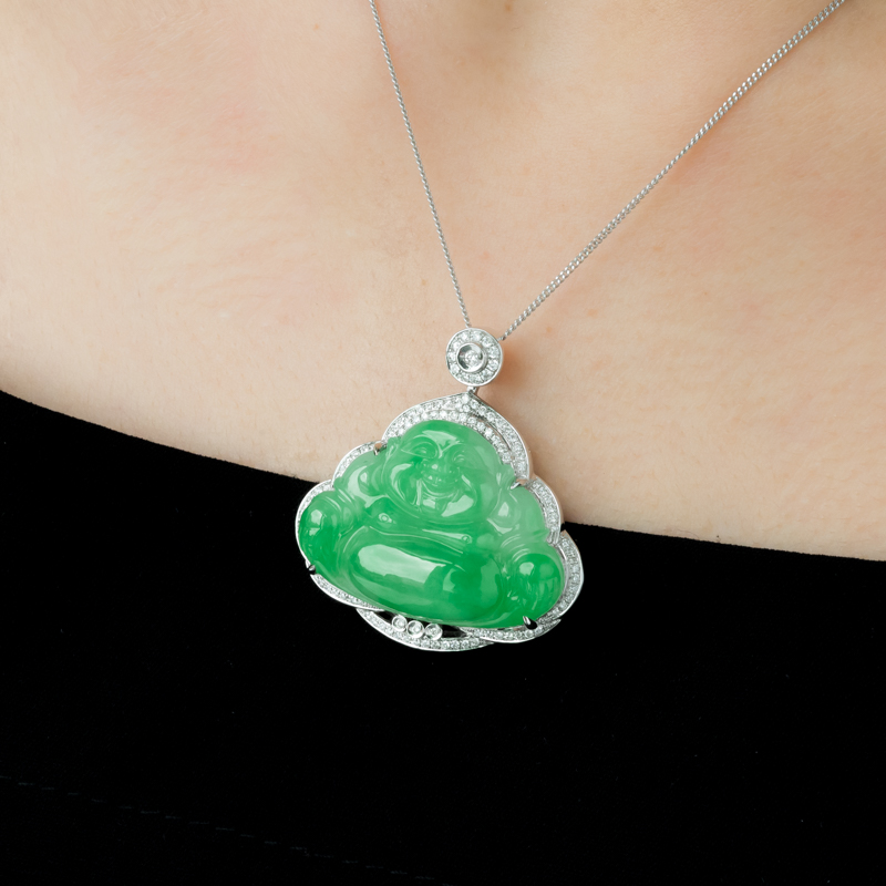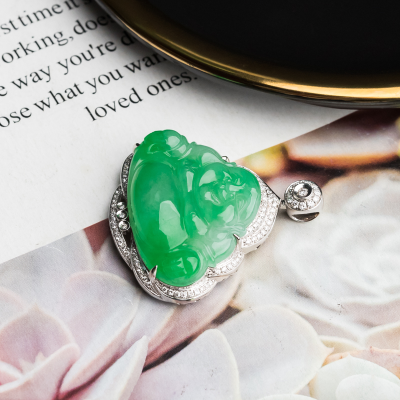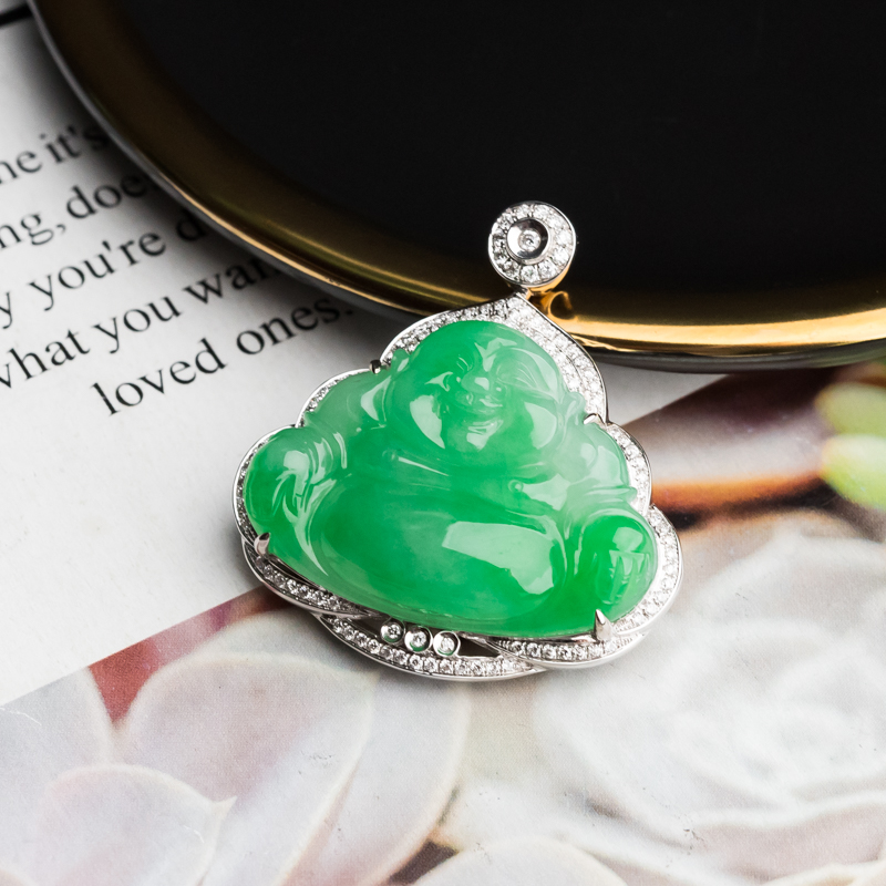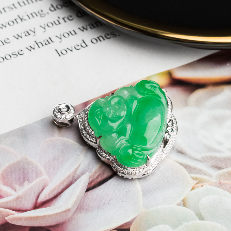 • 18K糯冰种苹果绿翡翠弥勒佛吊坠