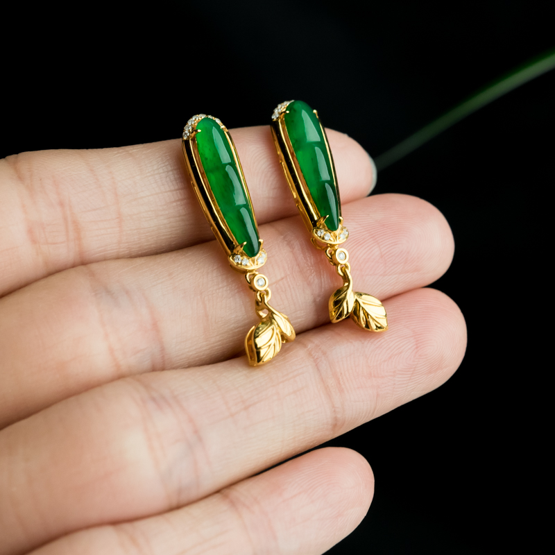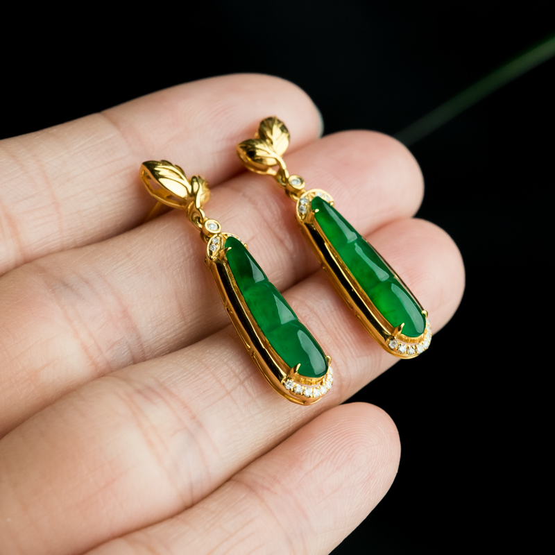 • 18K糯冰种翠绿翡翠福豆耳坠