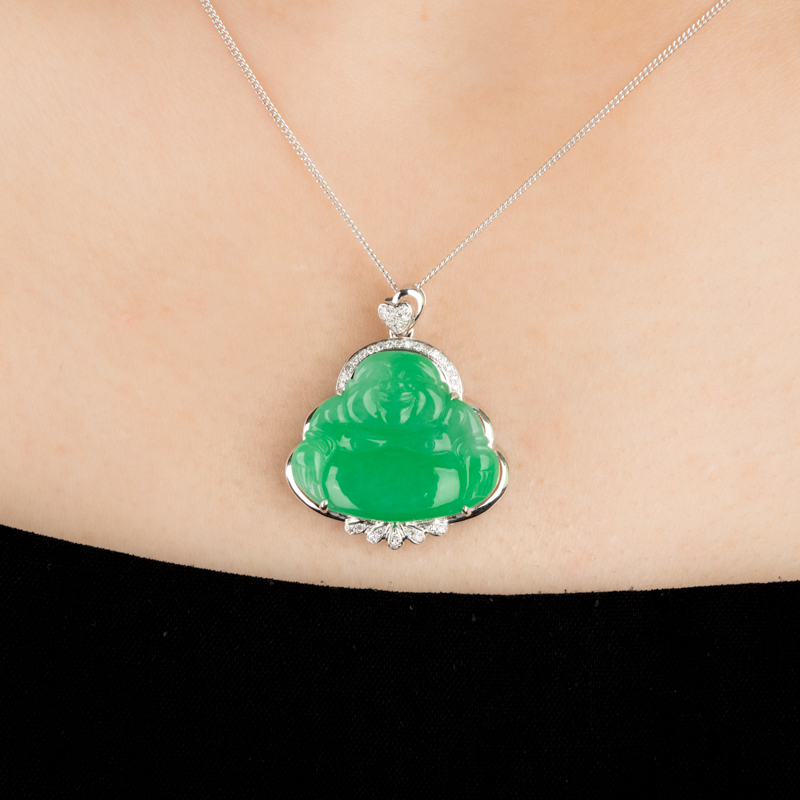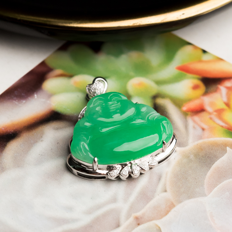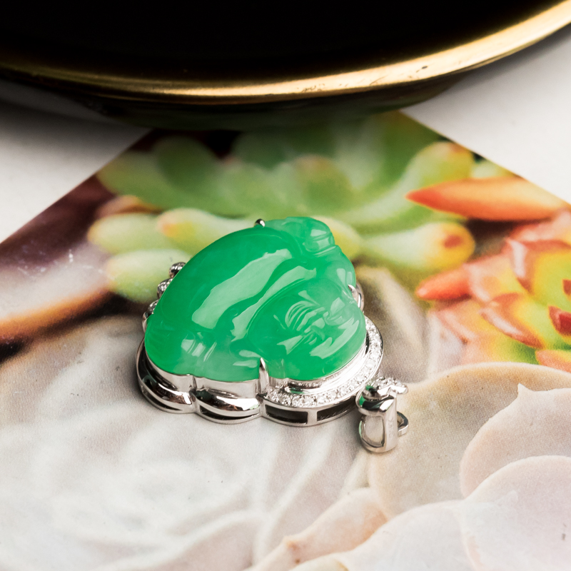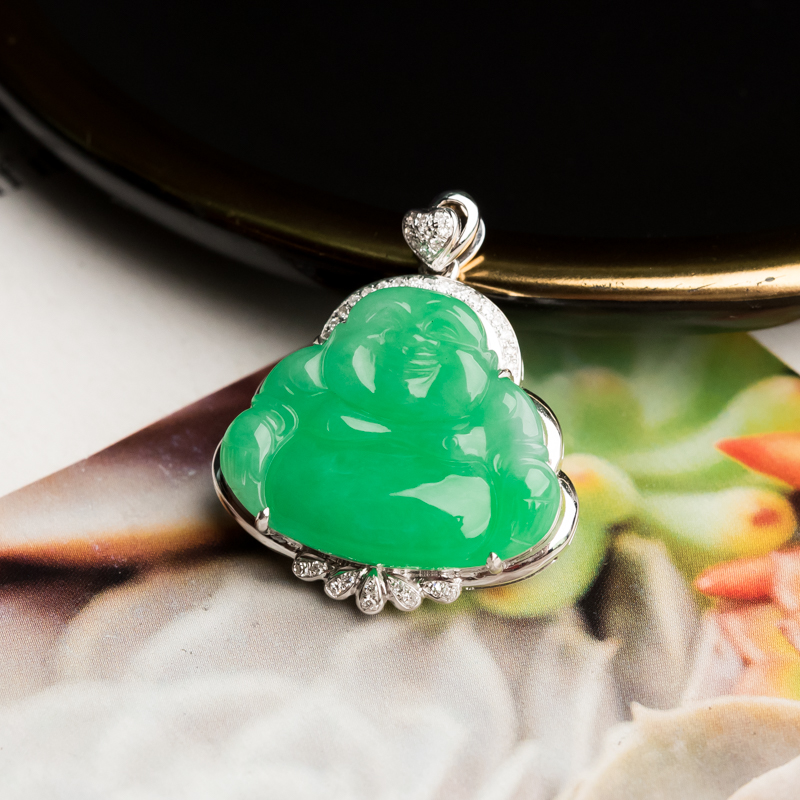 • 18K糯冰种苹果绿翡翠弥勒佛吊坠