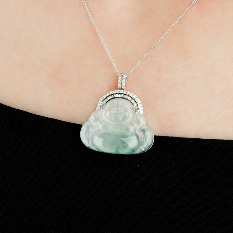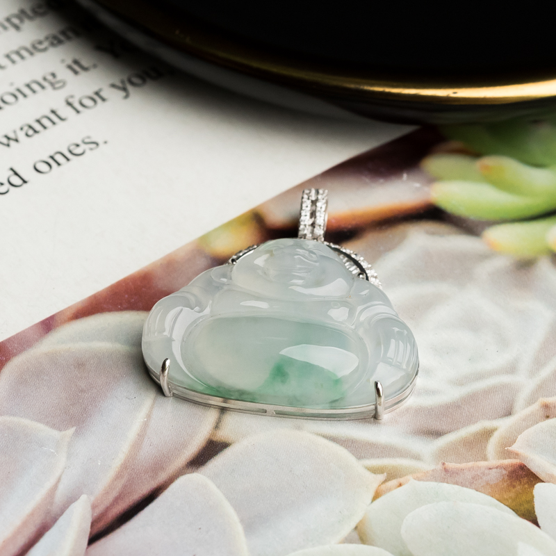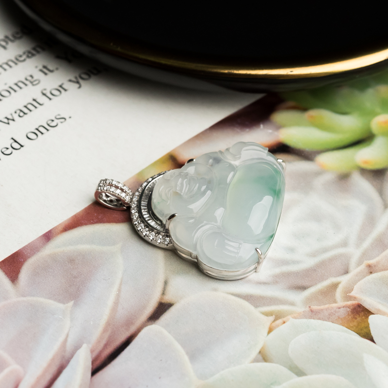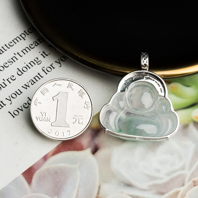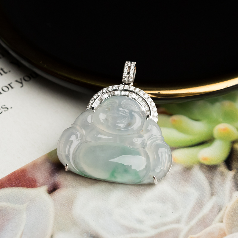 • 18K糯冰种飘花翡翠弥勒佛吊坠