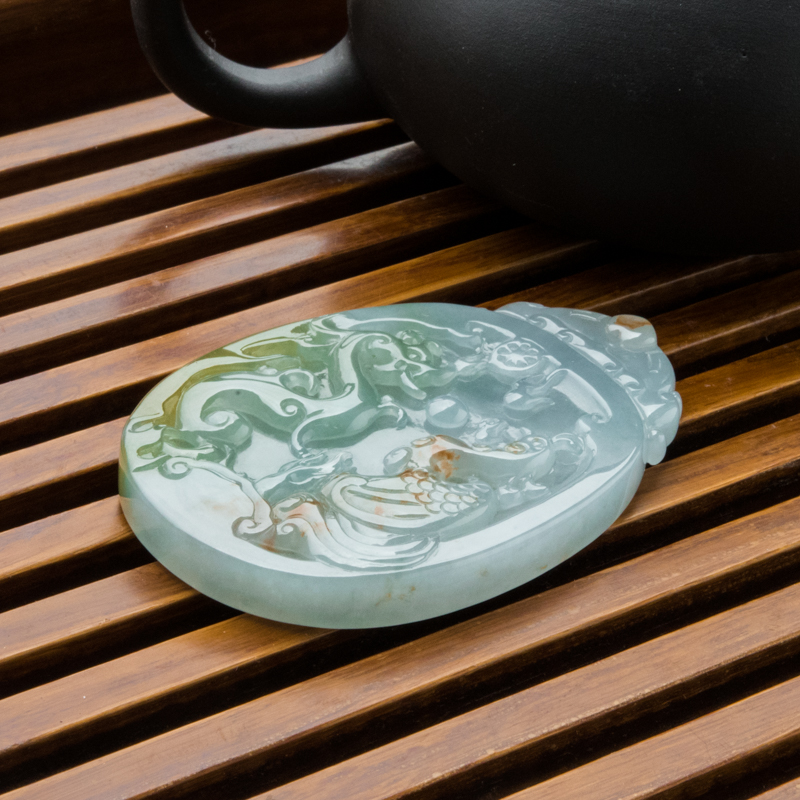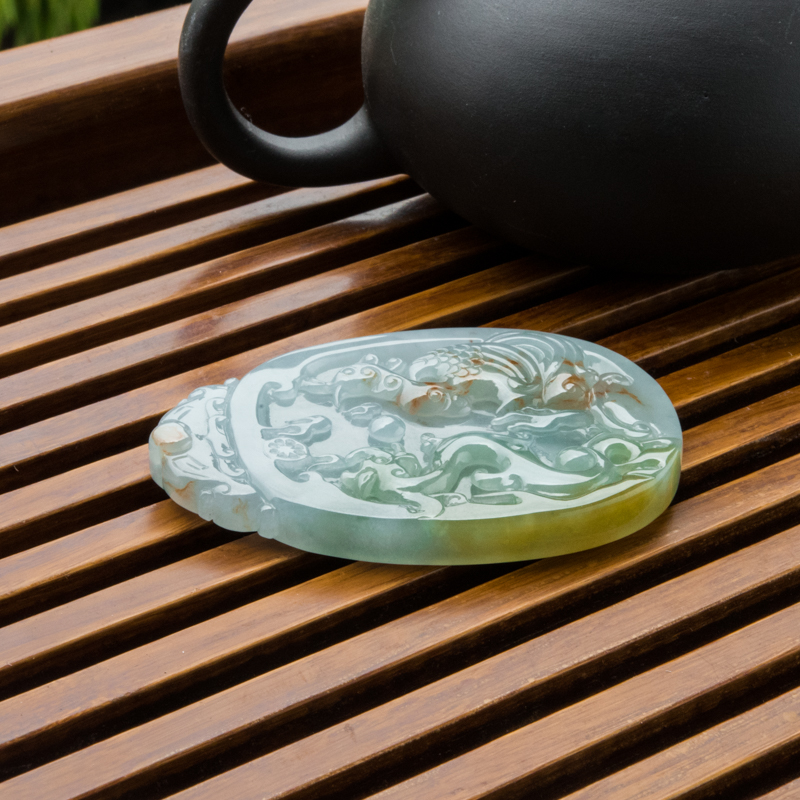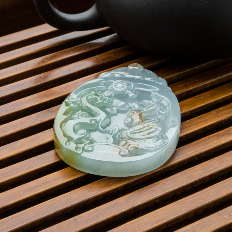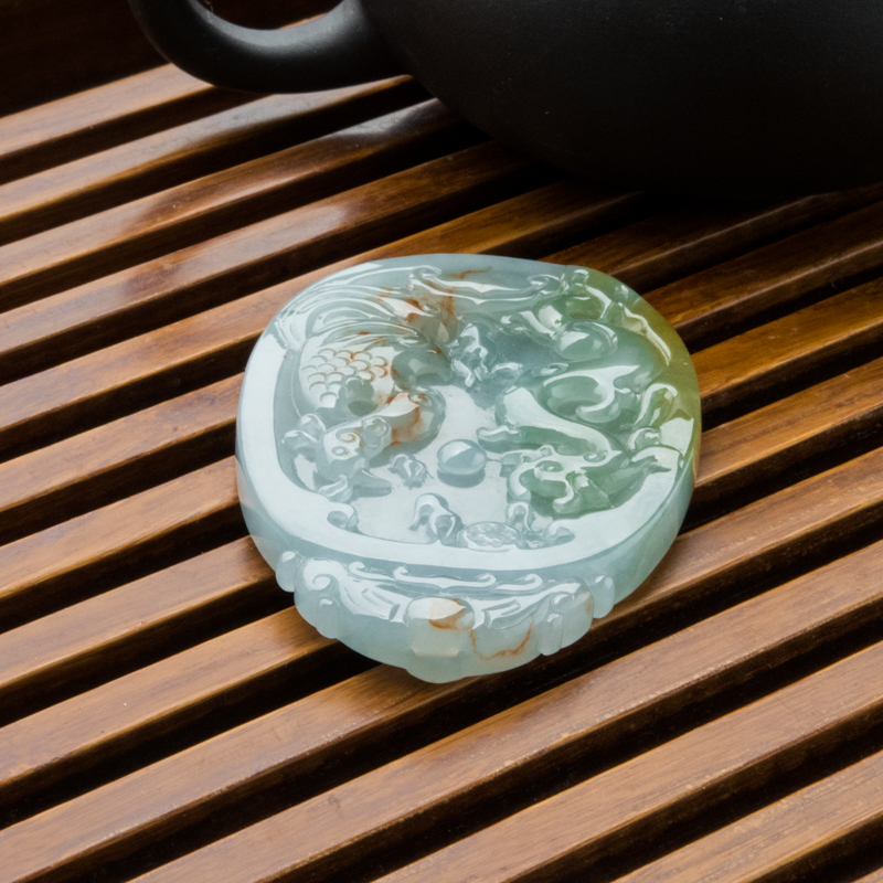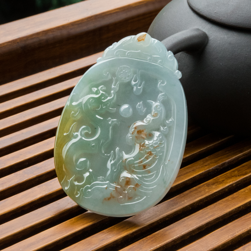 • 糯冰种飘黄翡翡翠龙凤呈祥吊坠