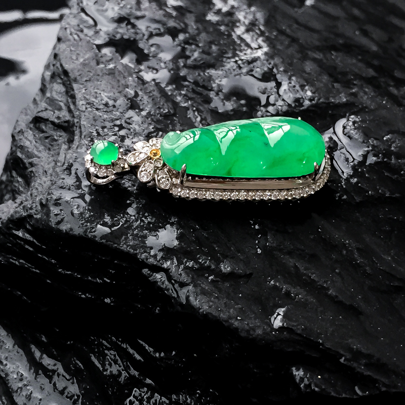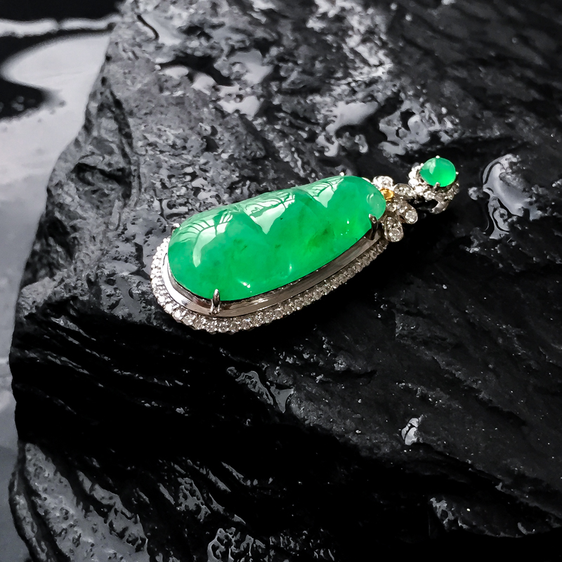• 18K糯冰种翠绿翡翠福豆吊坠