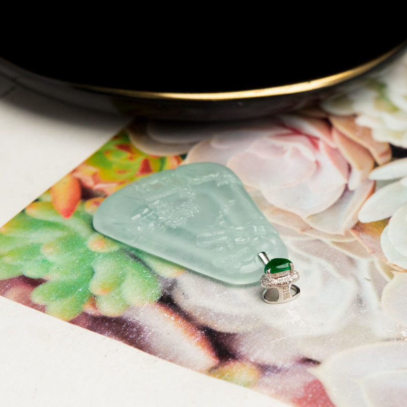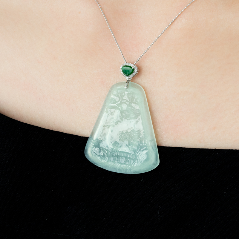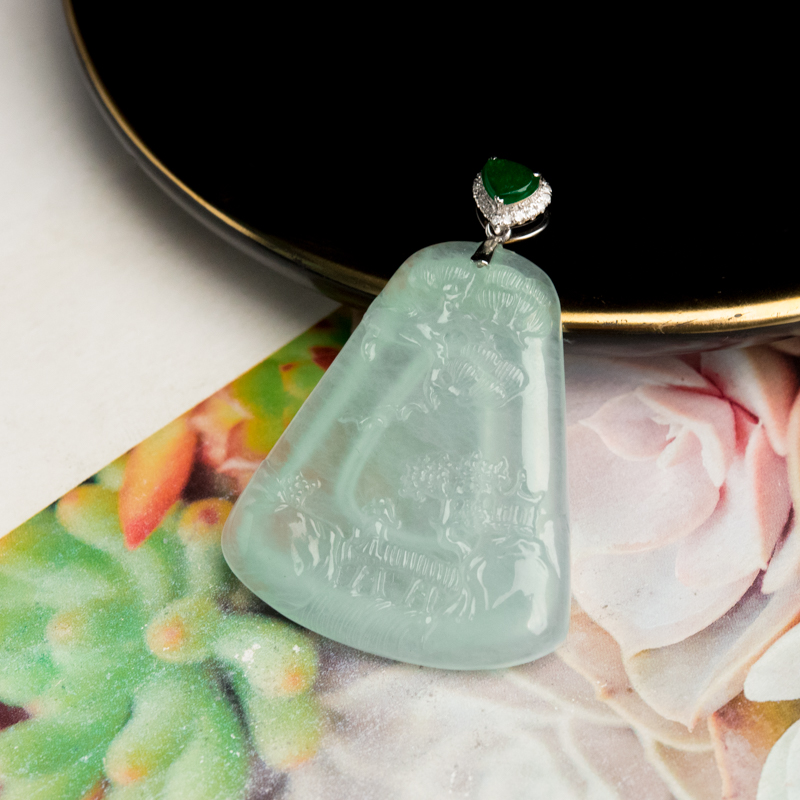 • 18K糯冰种淡晴水翡翠松下怀远吊坠