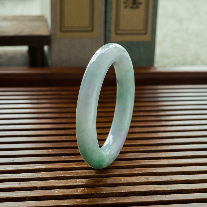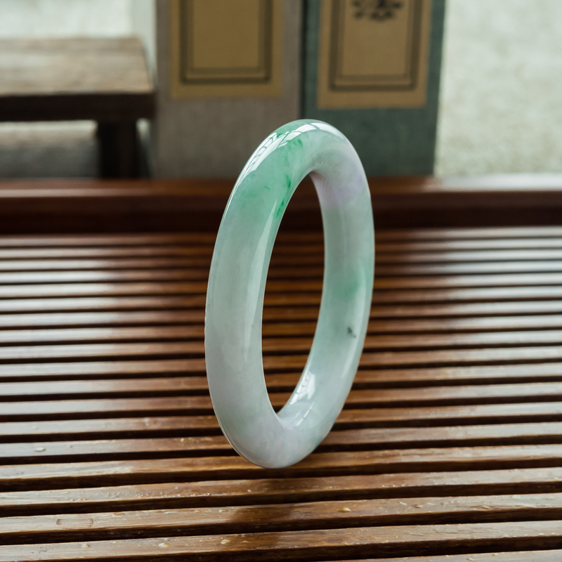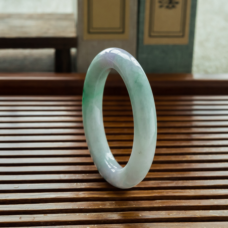 • 57.5mm糯冰种春带彩翡翠圆镯