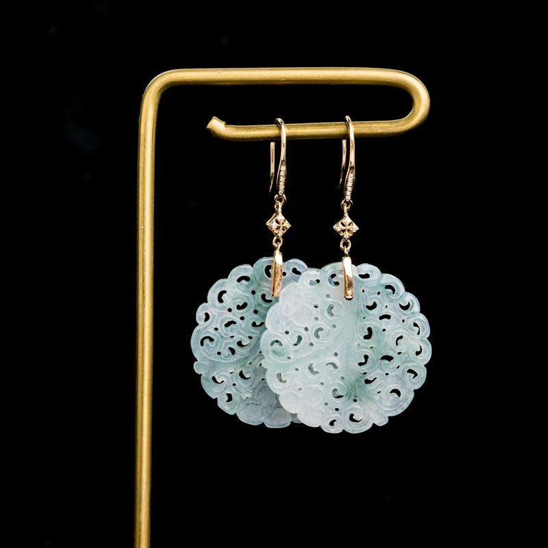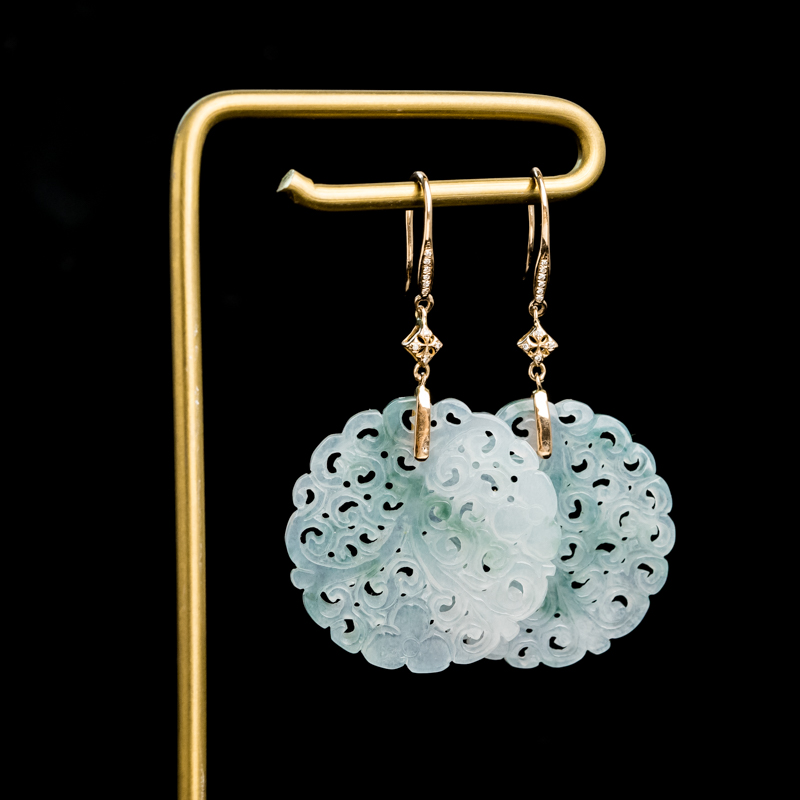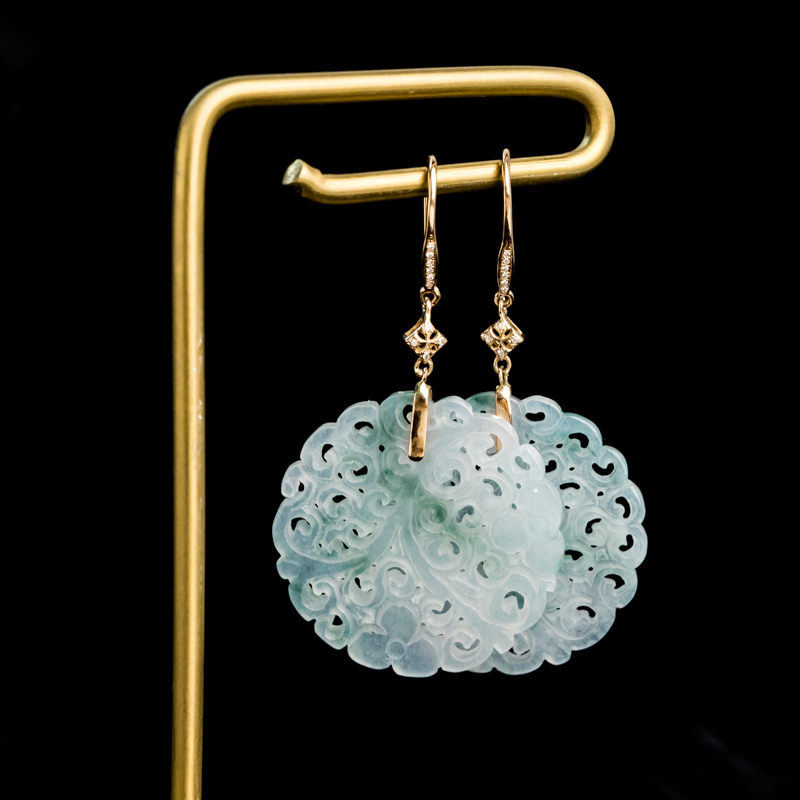 • 18K糯冰种飘花翡翠缠枝纹耳坠