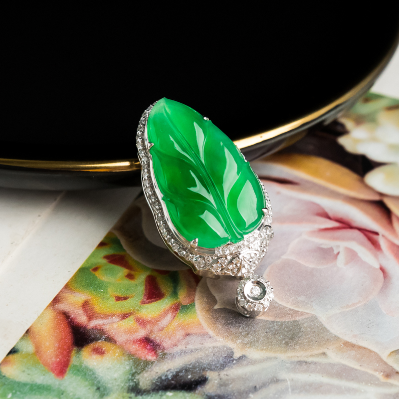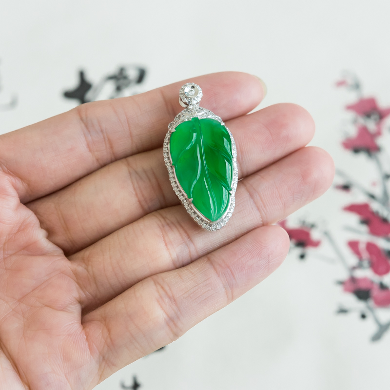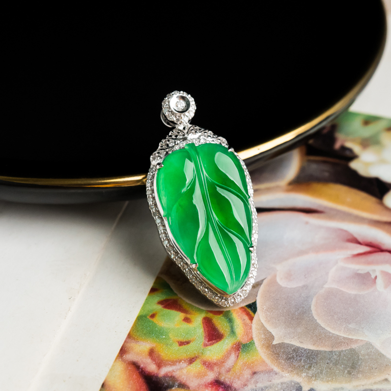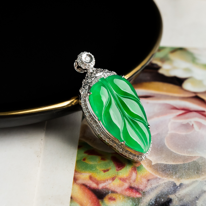 • 18K糯冰种阳绿翡翠金枝玉叶吊坠