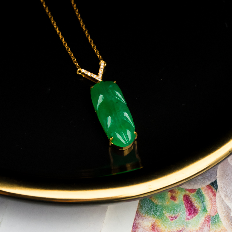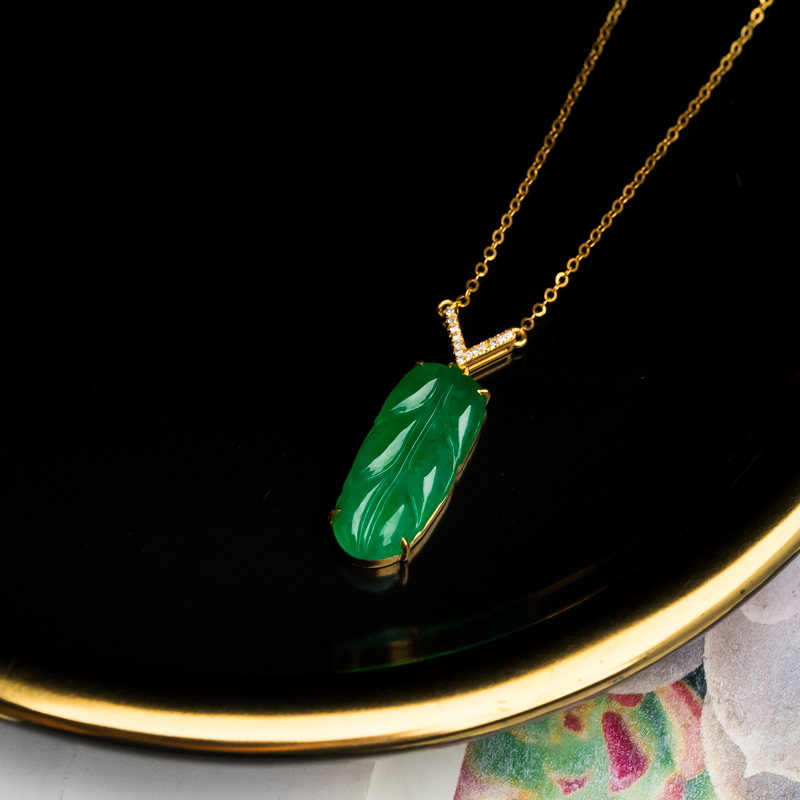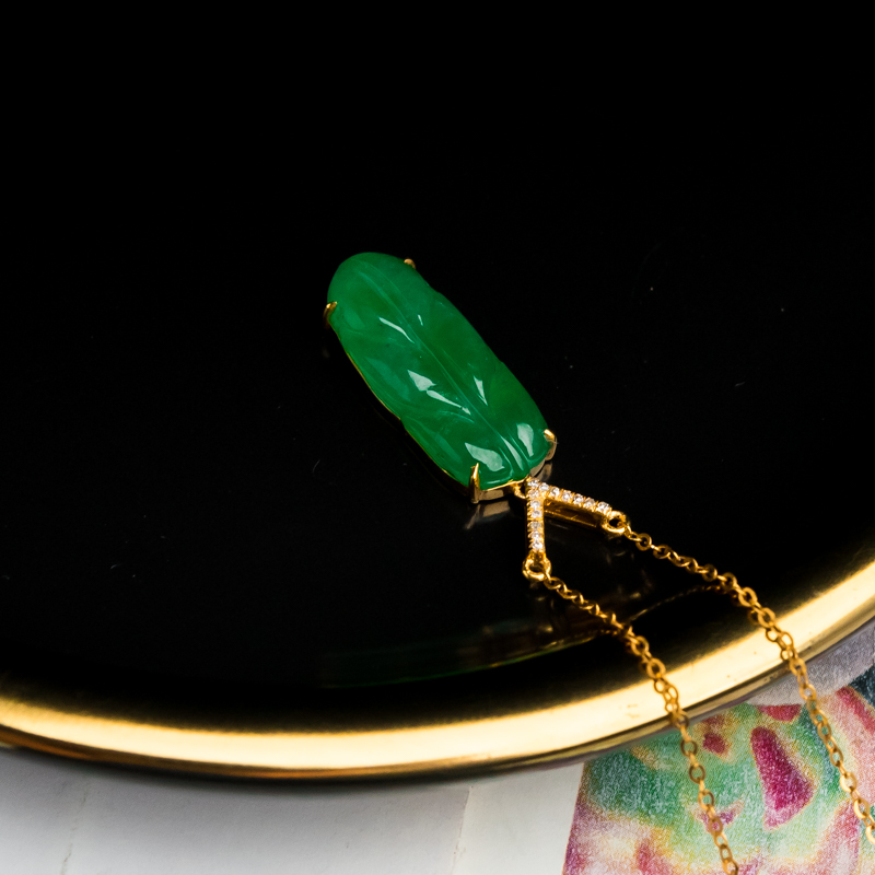 • 18K糯冰种翠绿翡翠金枝玉叶项链