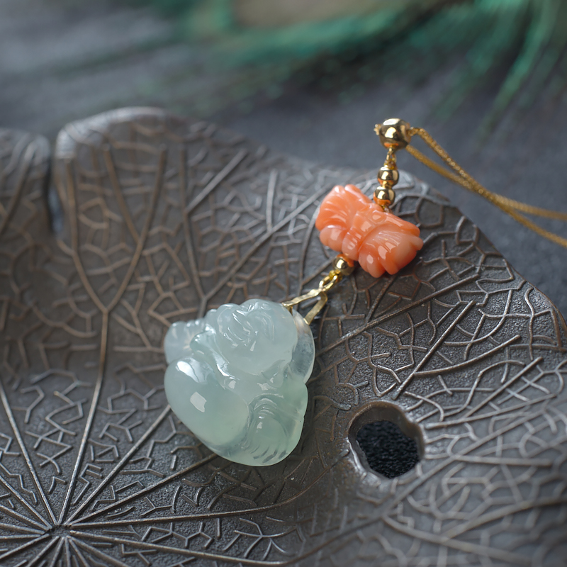 • 18K糯冰种浅绿翡翠弥勒佛项链