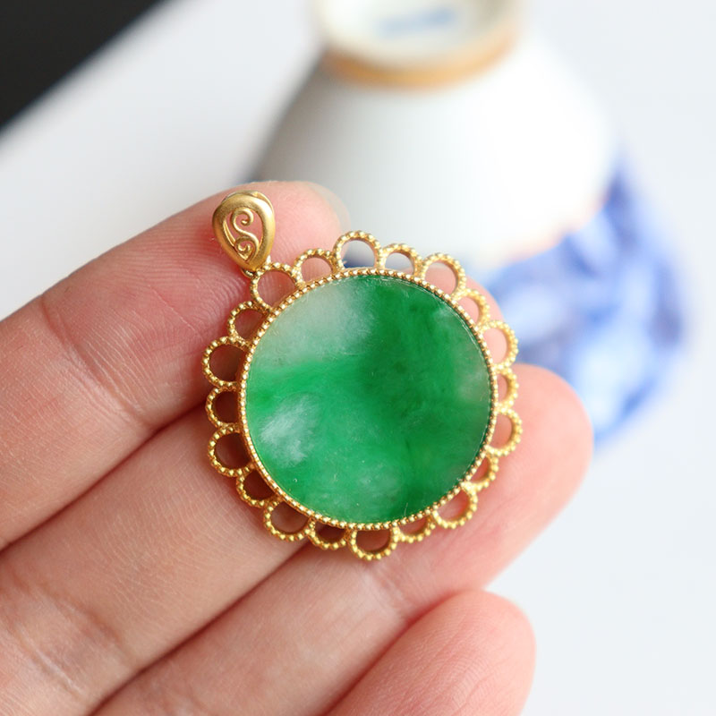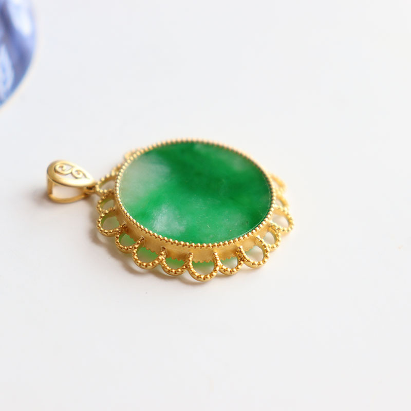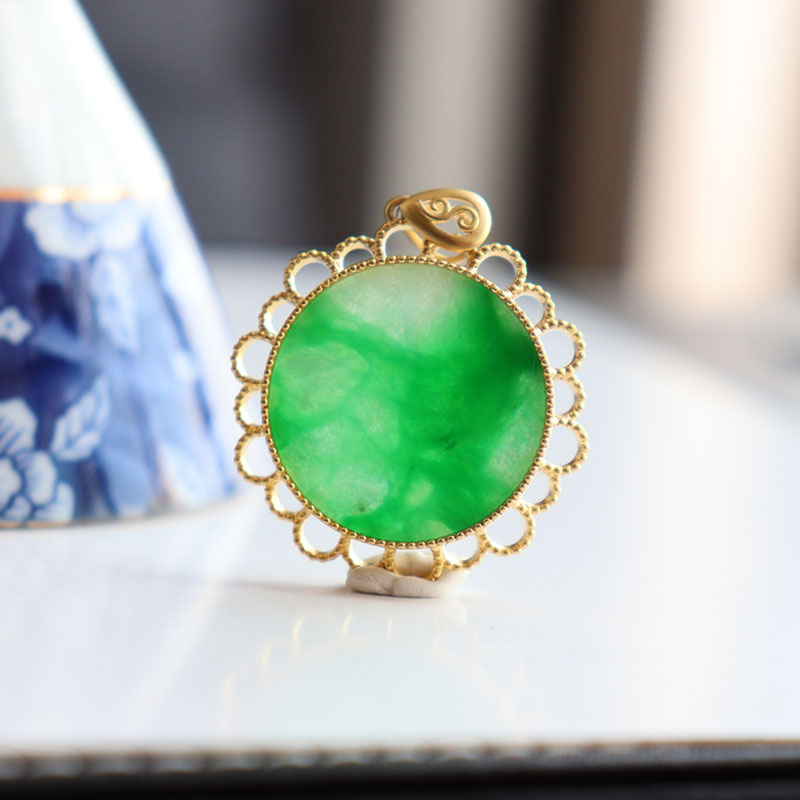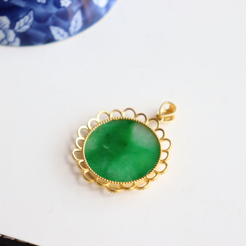 • 18k糯冰种翠绿翡翠无事牌吊坠