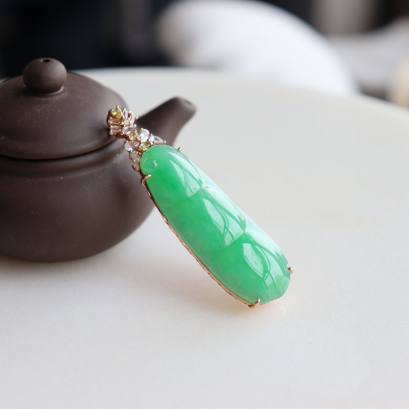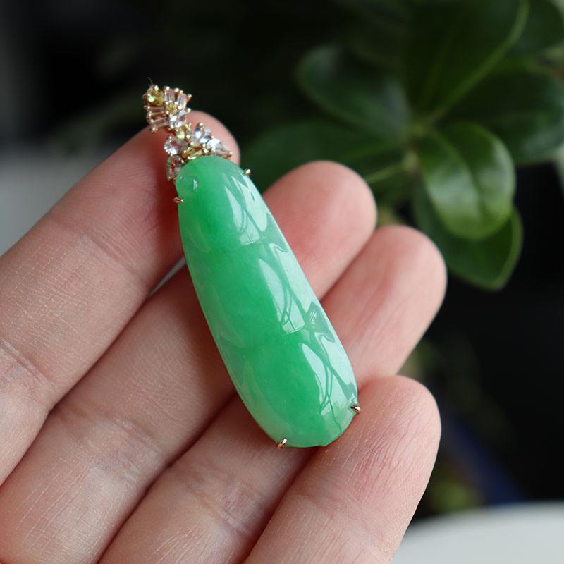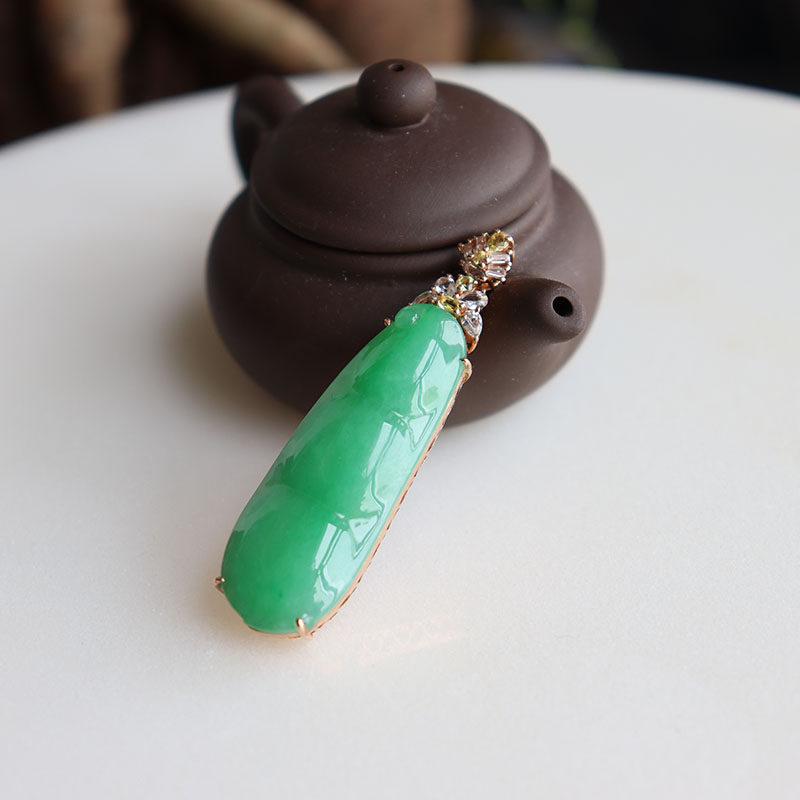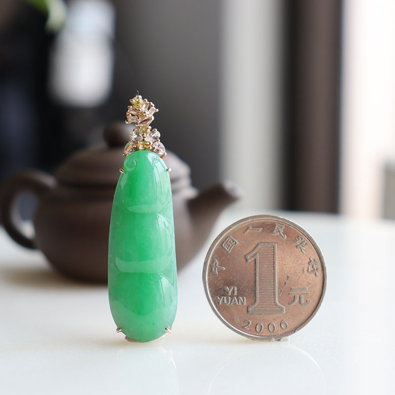 • 18k糯冰种翠绿翡翠连中三元吊坠