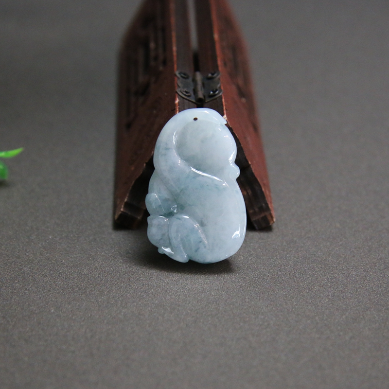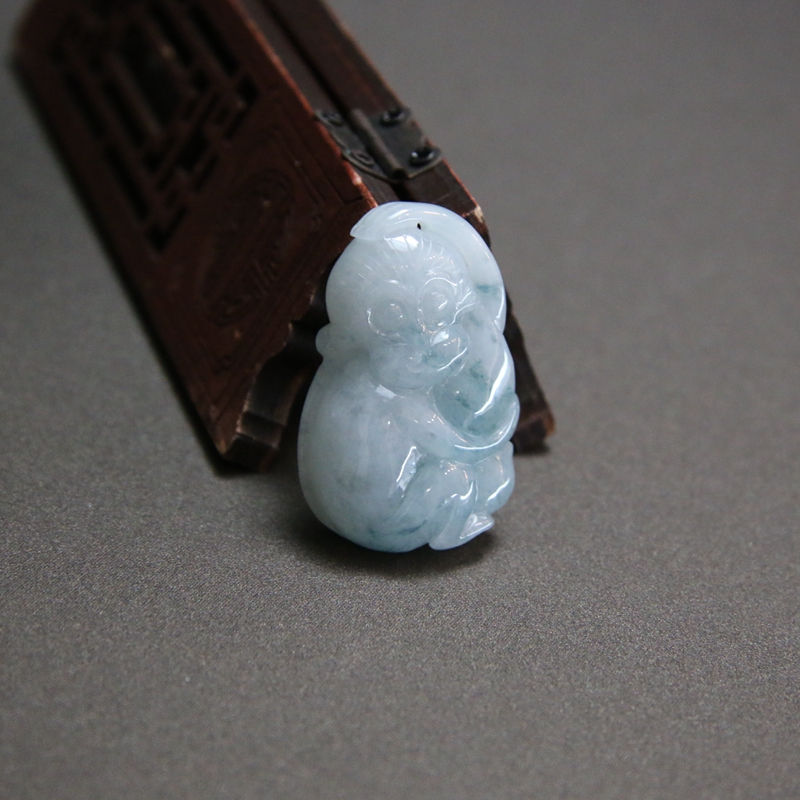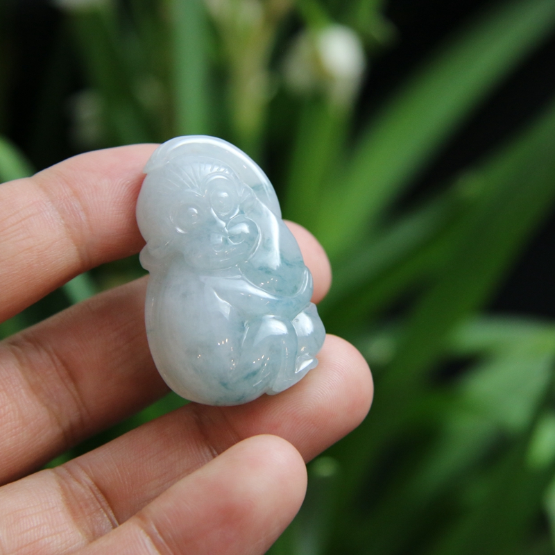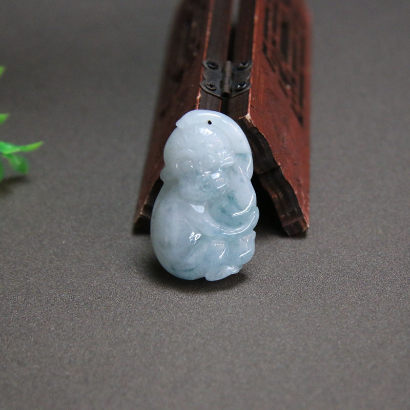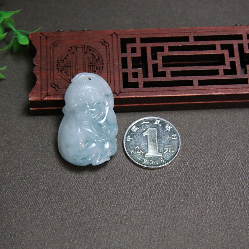 • 糯冰种飘花翡翠灵猴献瑞吊坠