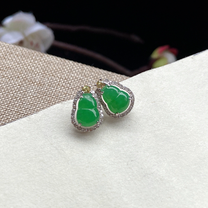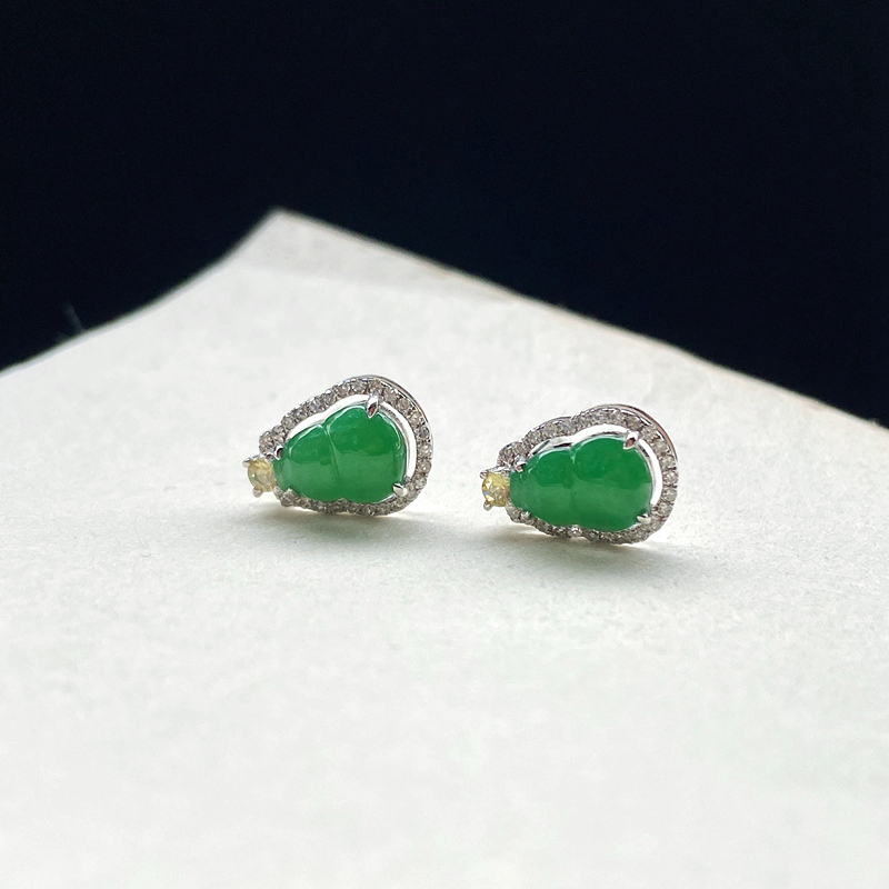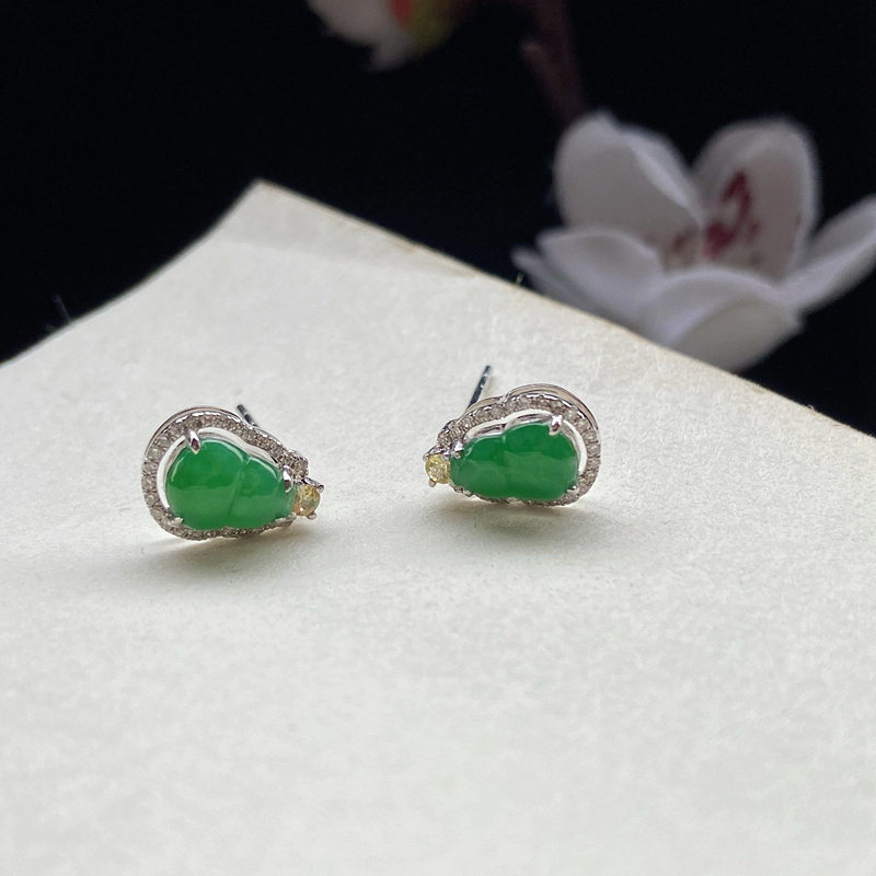 • 18K糯冰种翠绿翡翠葫芦耳钉