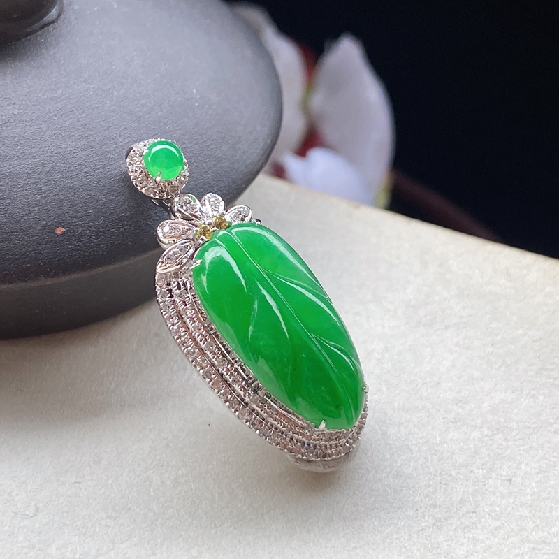 • 18K糯冰种翠绿翡翠叶子吊坠