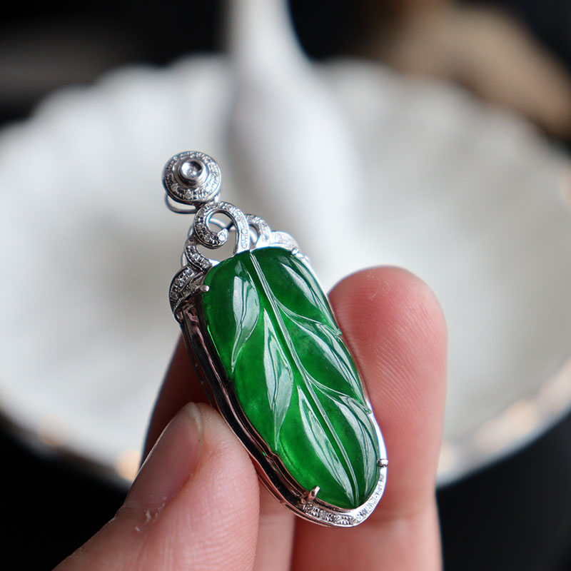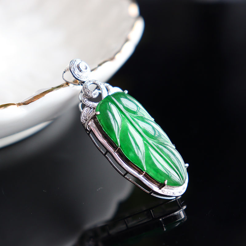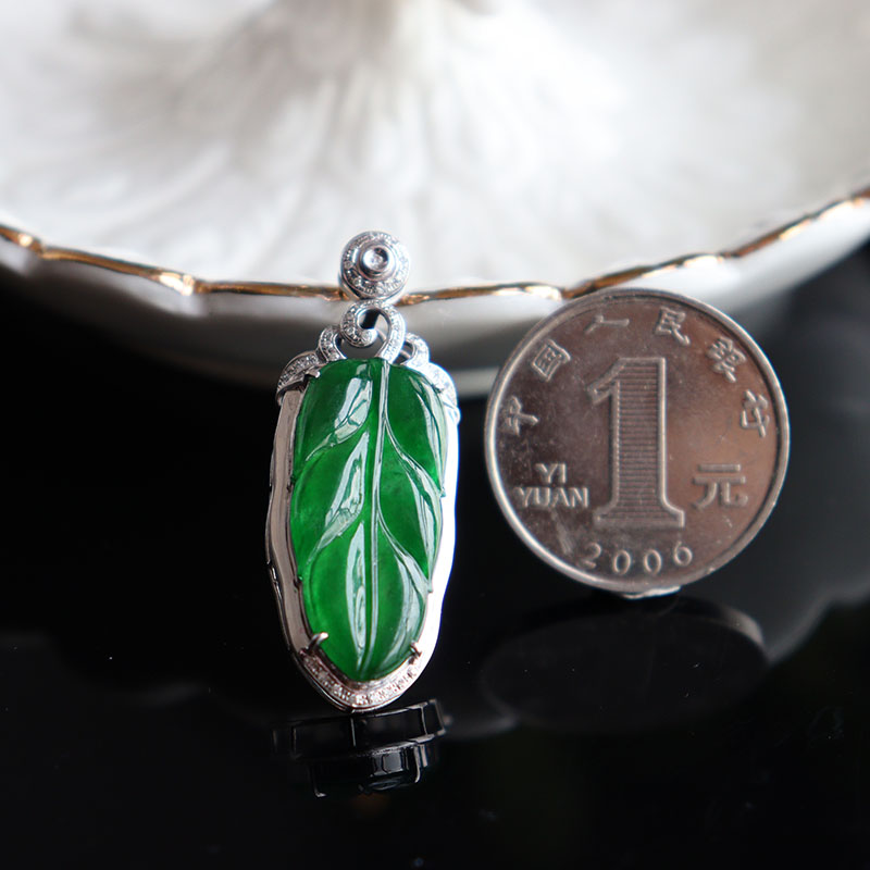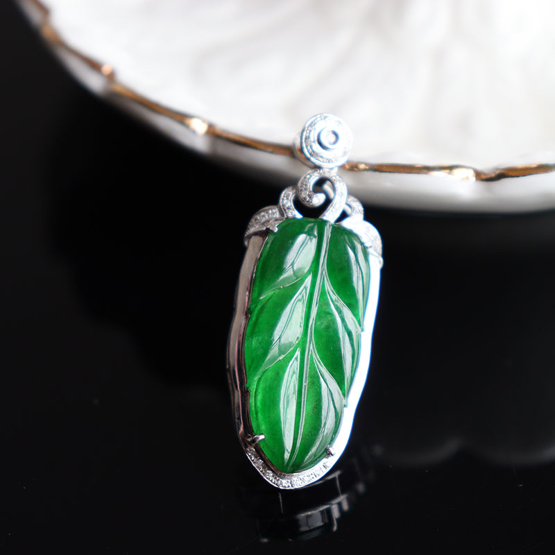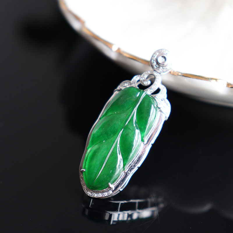 • 18k糯冰种翠绿翡翠金枝玉叶吊坠