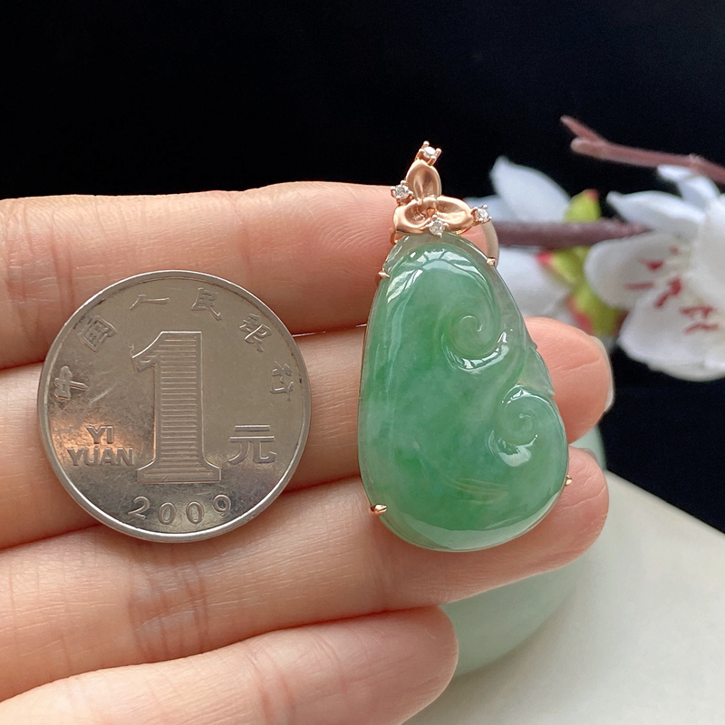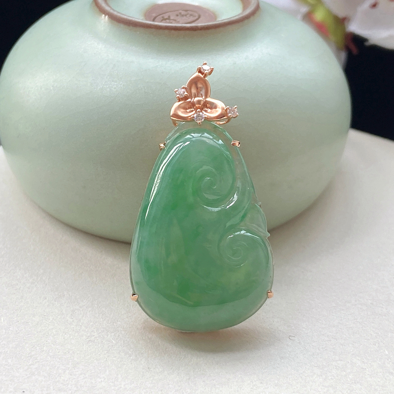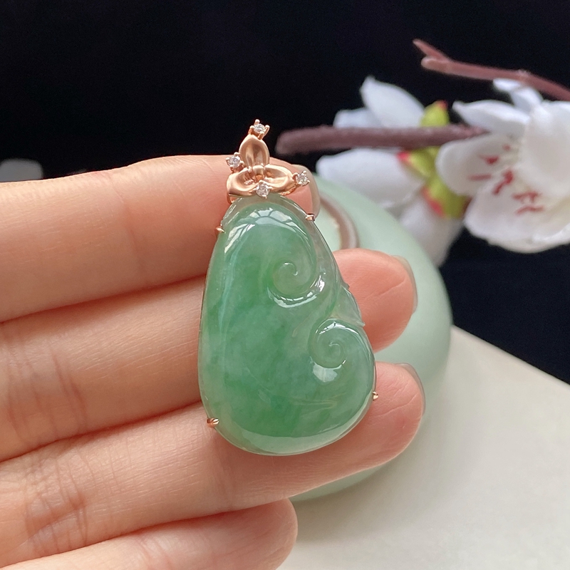 • 18K糯冰种浅绿翡翠如意吊坠