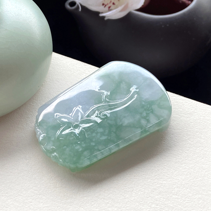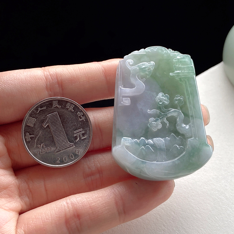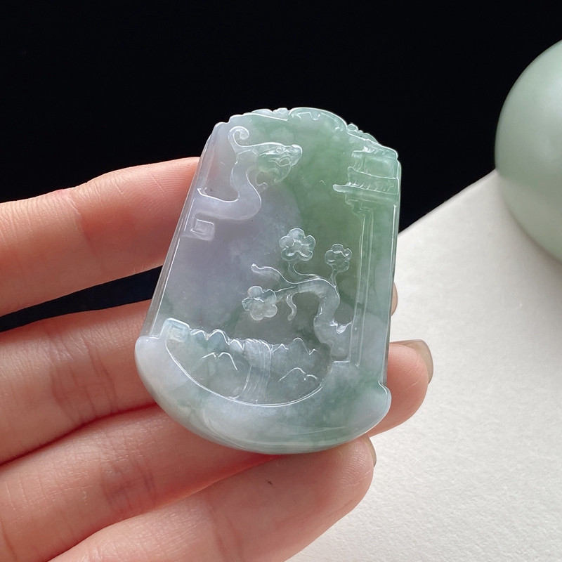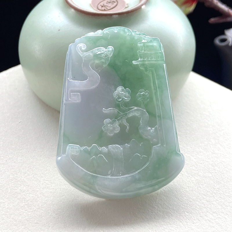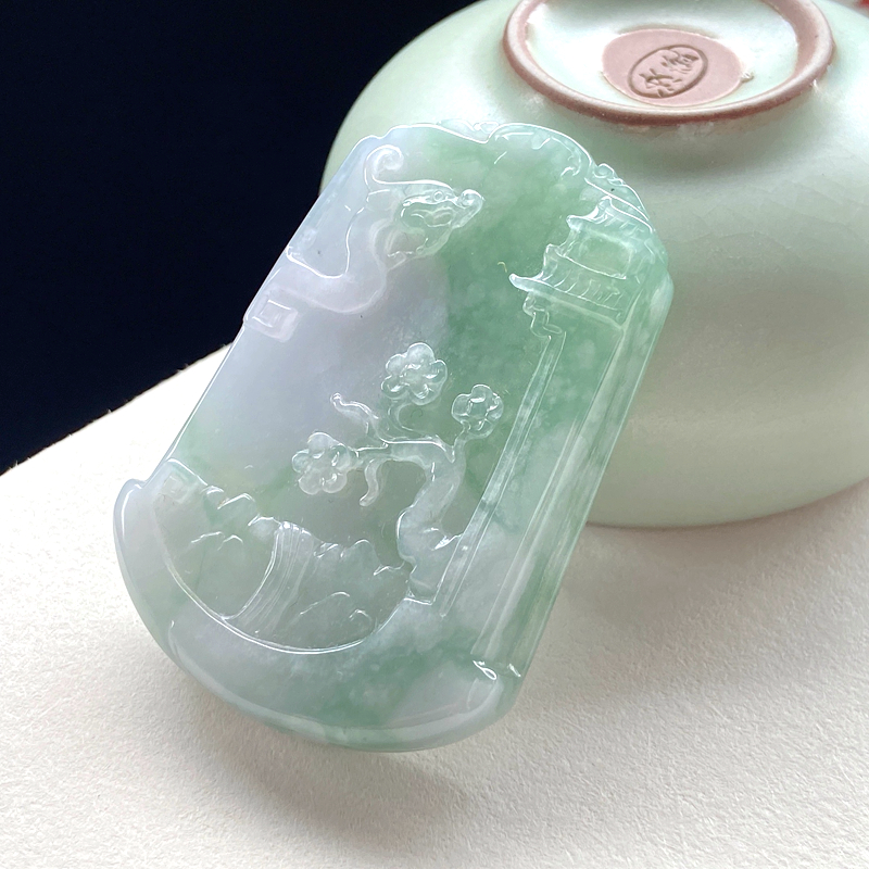 • 糯冰种春带彩翡翠山水意境吊坠