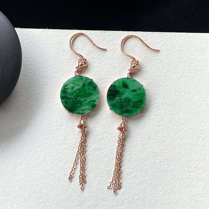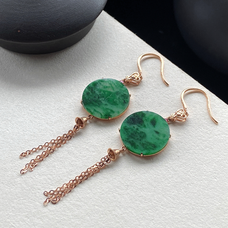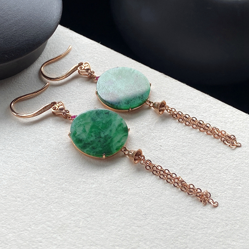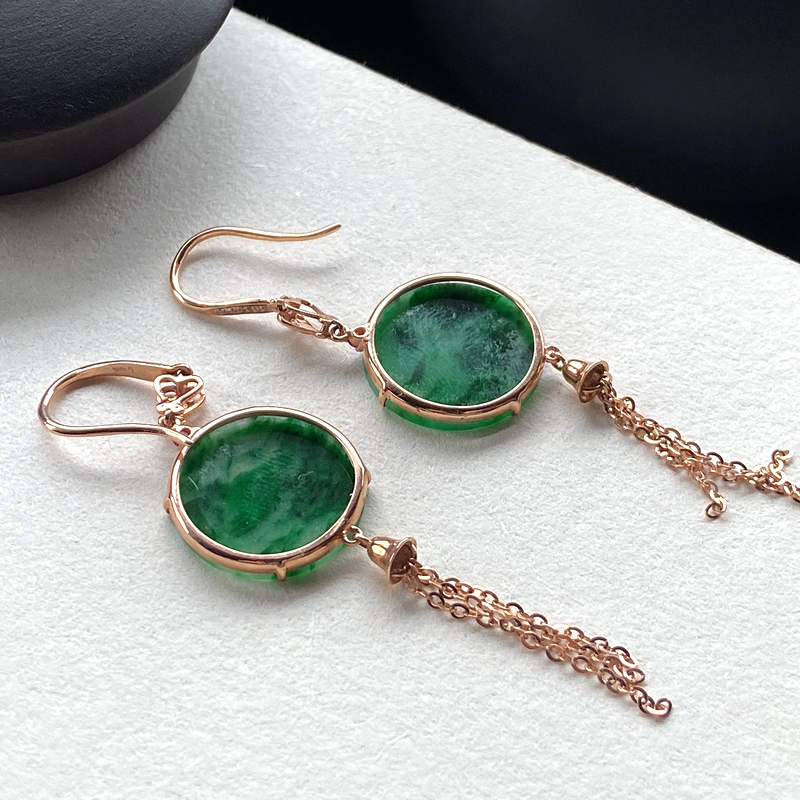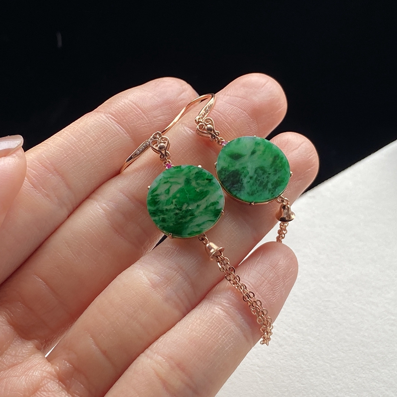 • 18K糯冰种带色翡翠平安无事耳坠