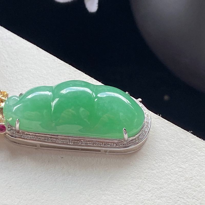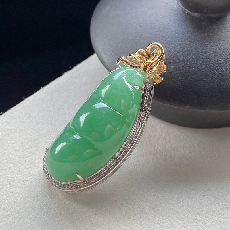 • 18K糯冰种豆绿翡翠福豆吊坠
