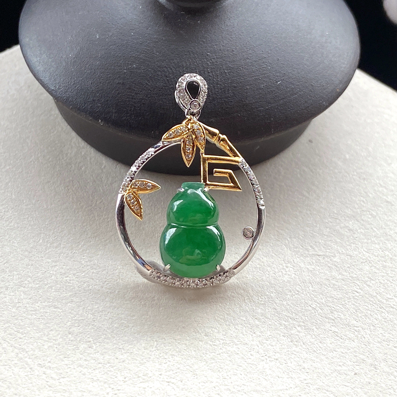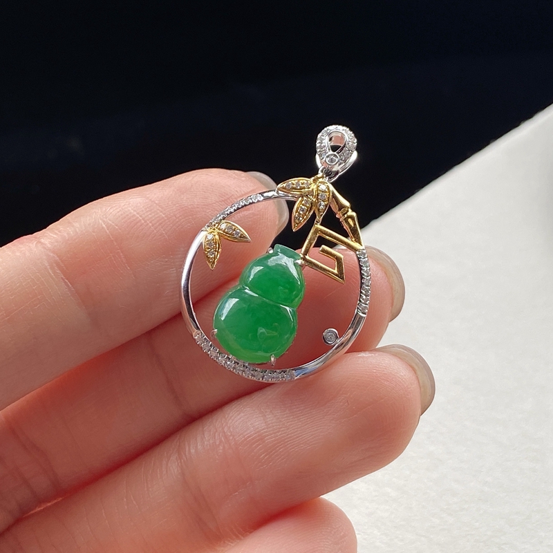• 18K糯冰种翠绿翡翠葫芦吊坠