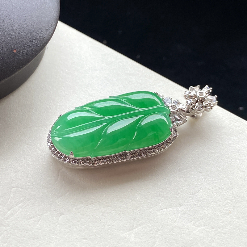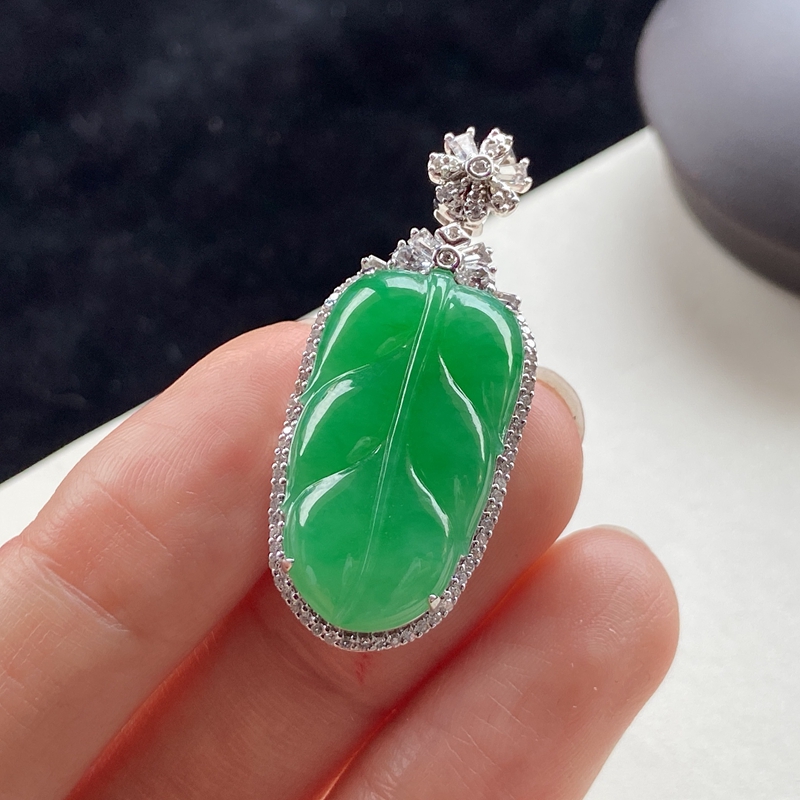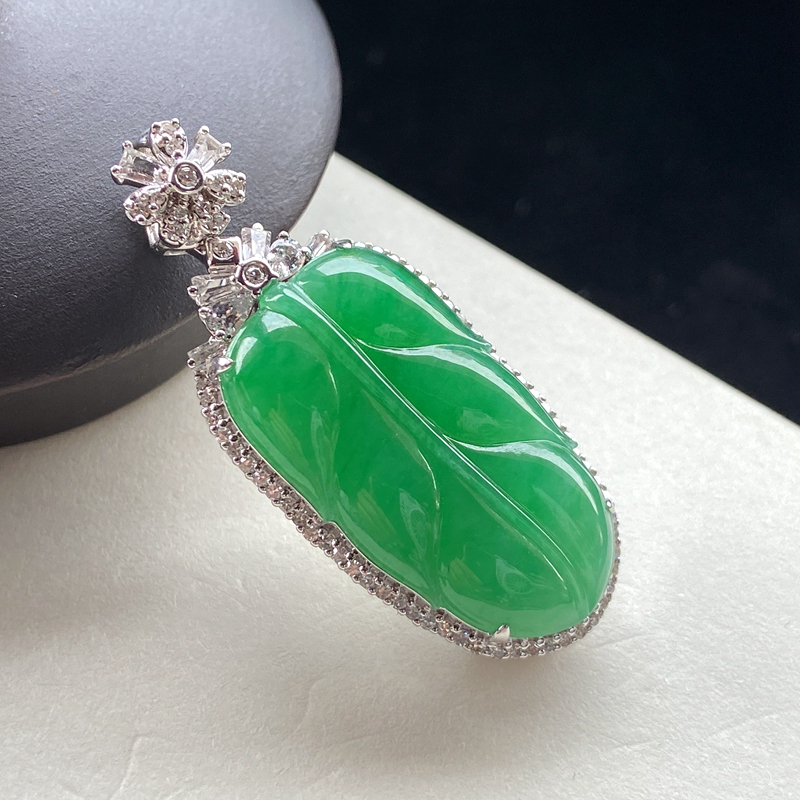 • 18K糯冰种苹果绿翡翠金枝玉叶吊坠