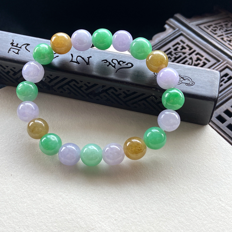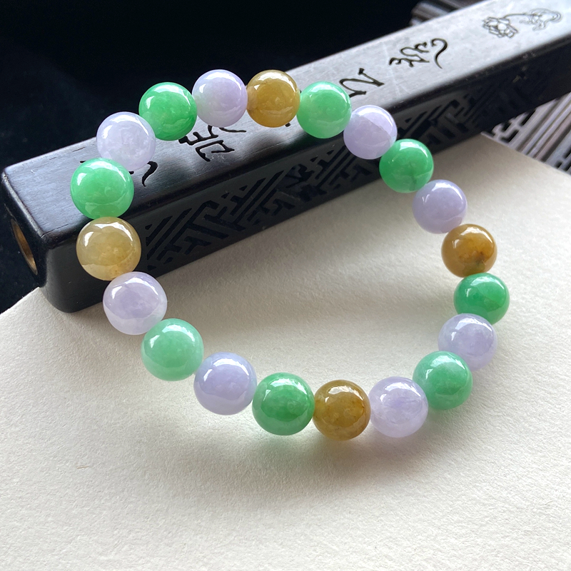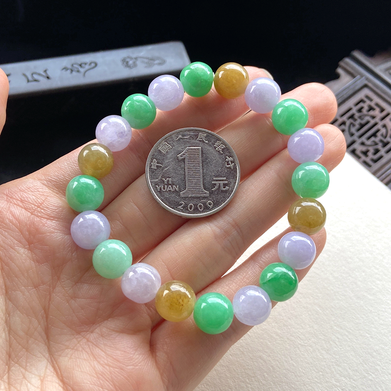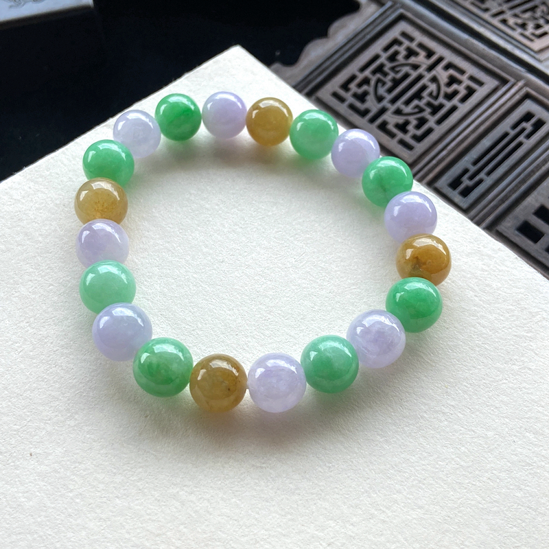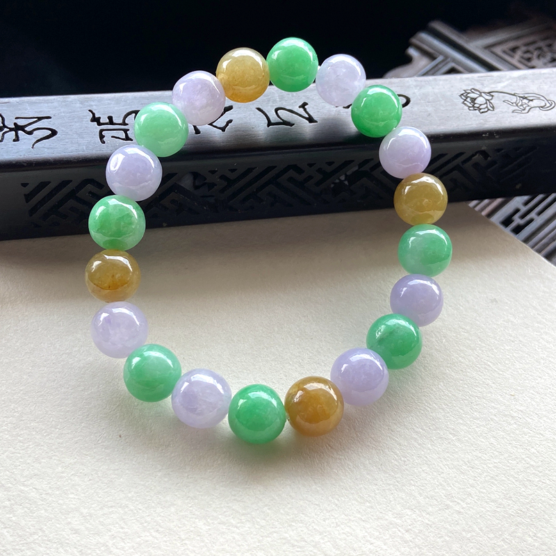 • 9.5mm糯冰种三彩翡翠圆珠单圈手串