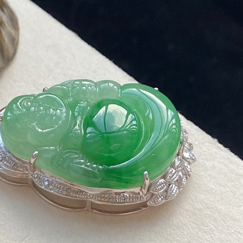 • 18K糯冰种豆绿翡翠弥勒佛吊坠