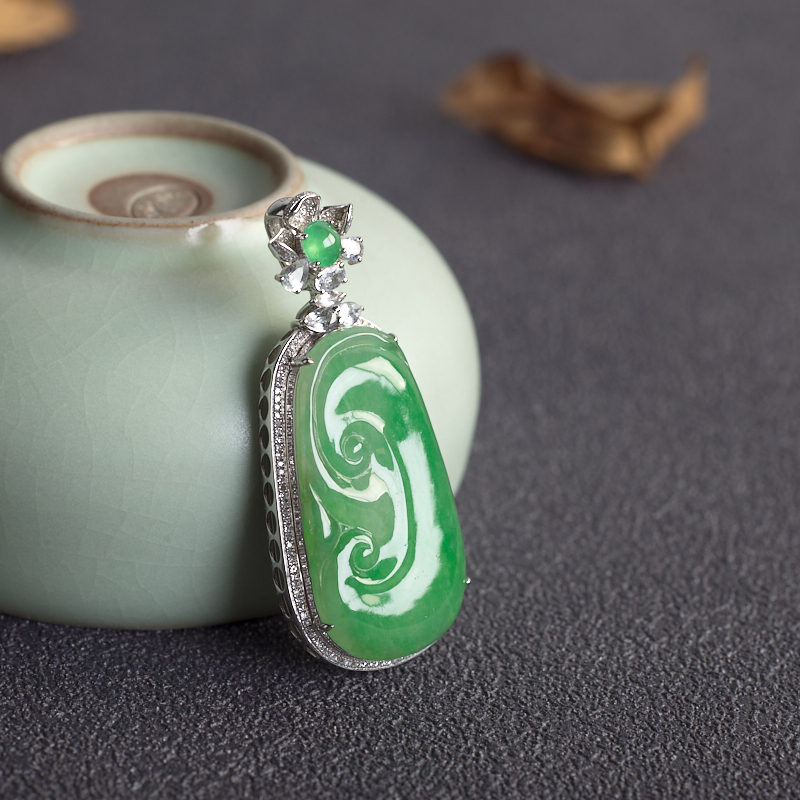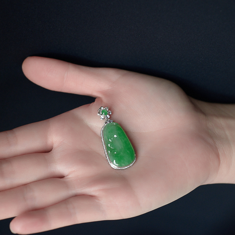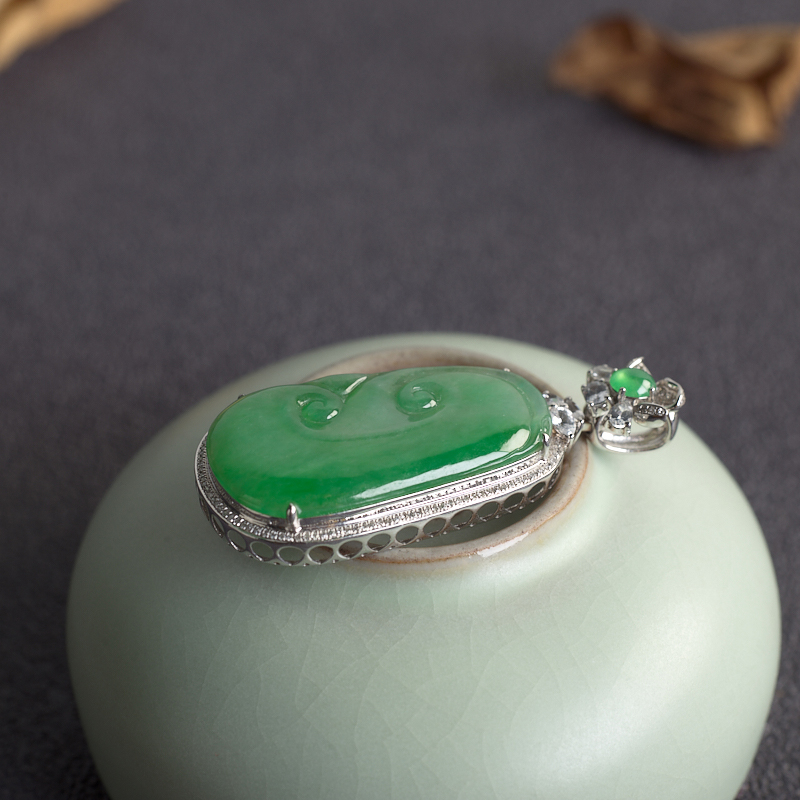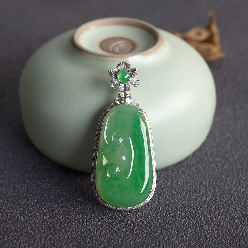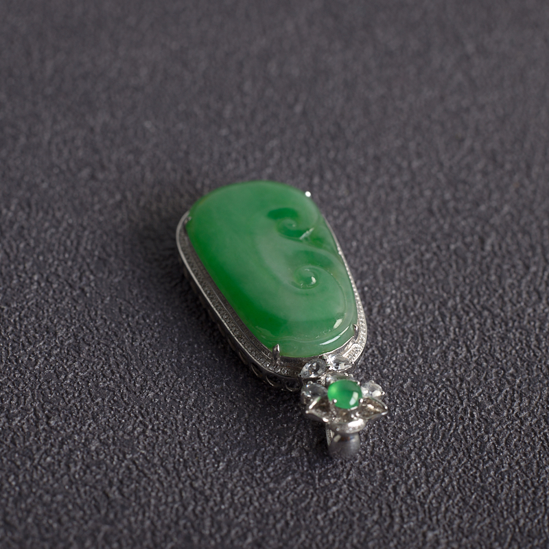• 18K糯冰种苹果绿翡翠如意吊坠