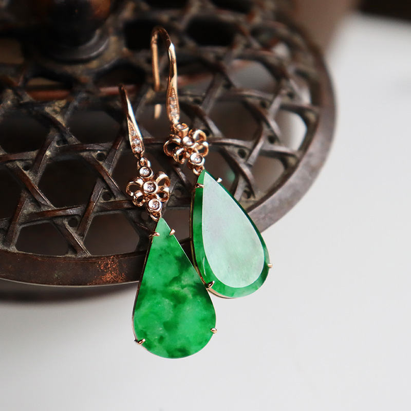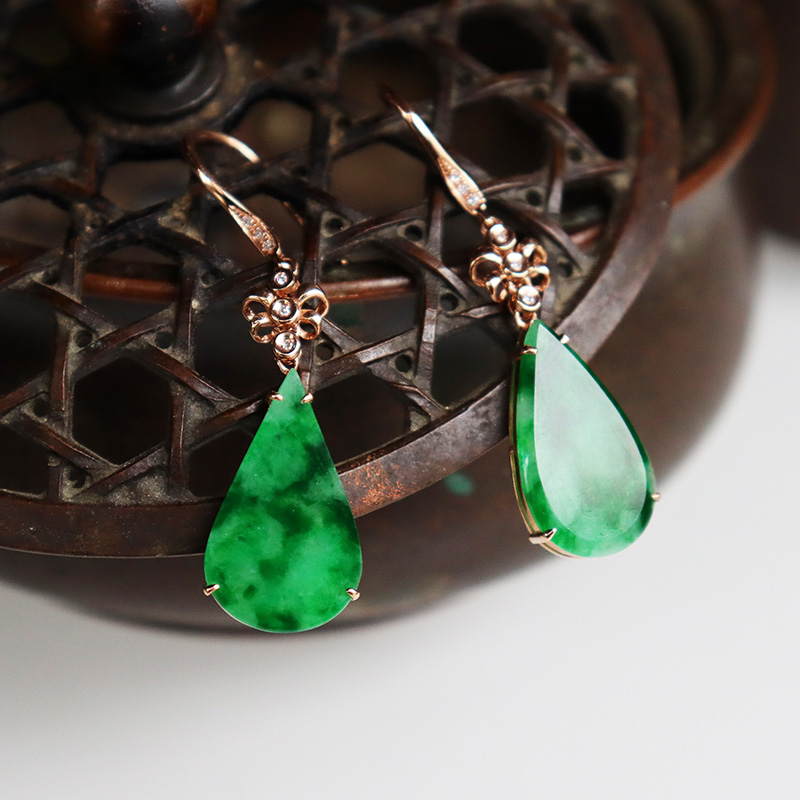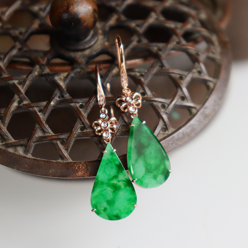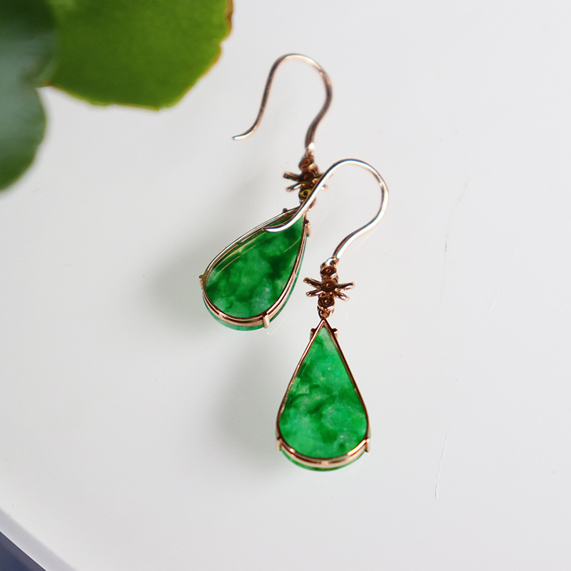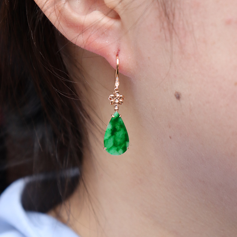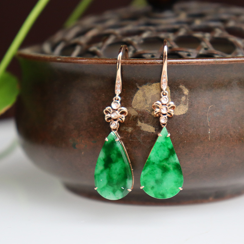 • 18k糯冰种翠绿翡翠水滴耳坠