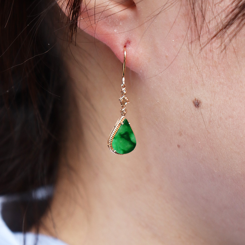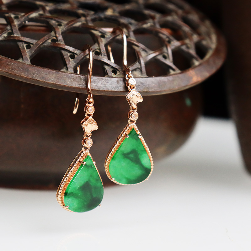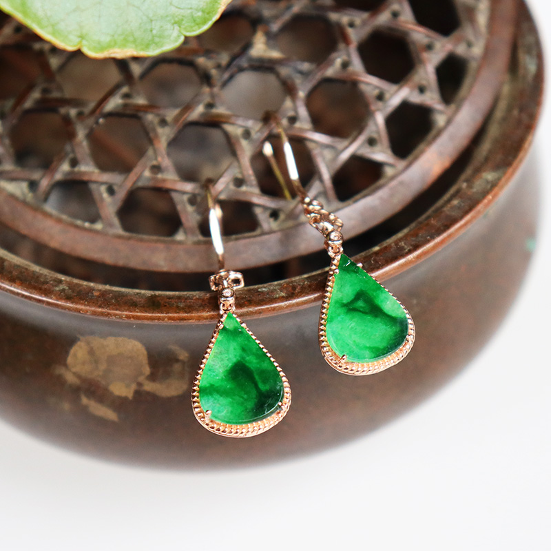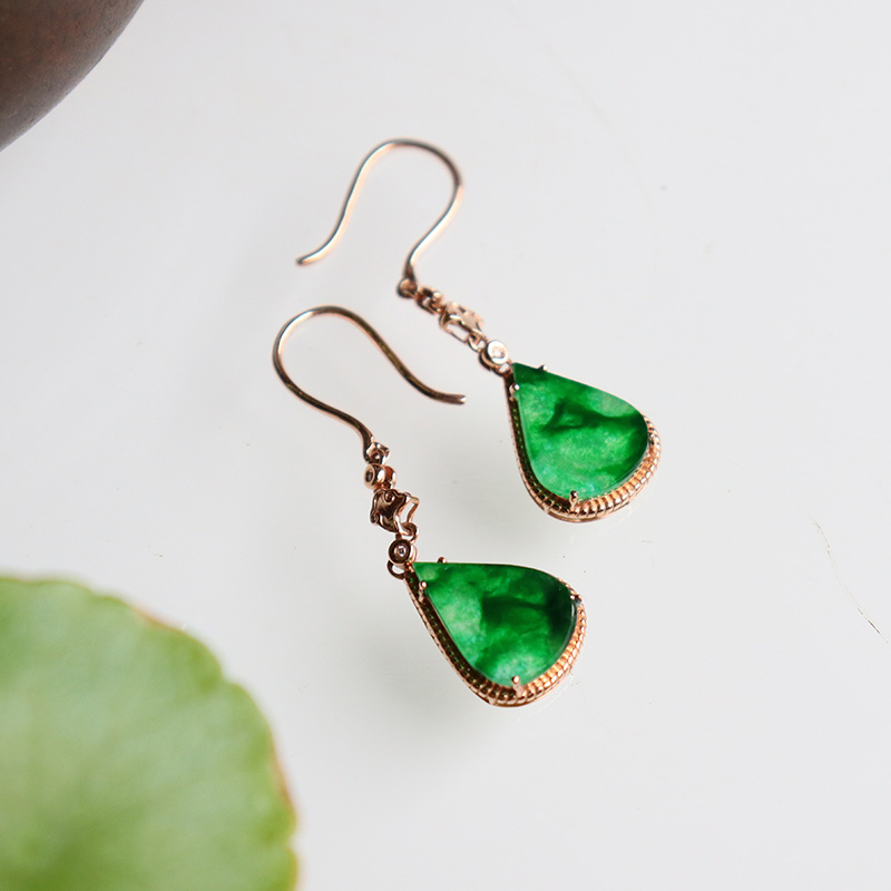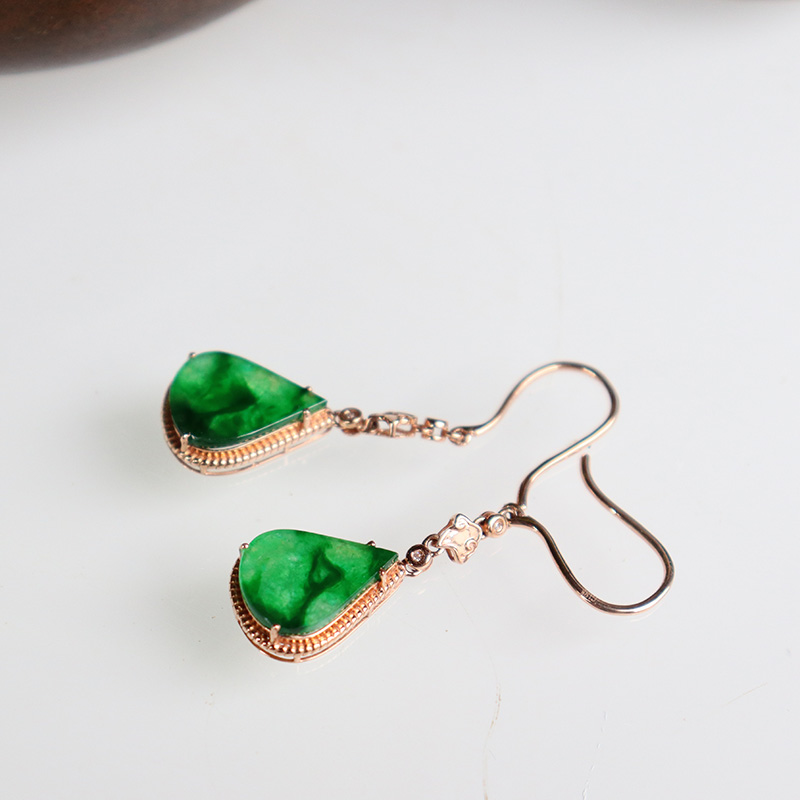 • 18k糯冰种翠绿翡翠水滴耳坠