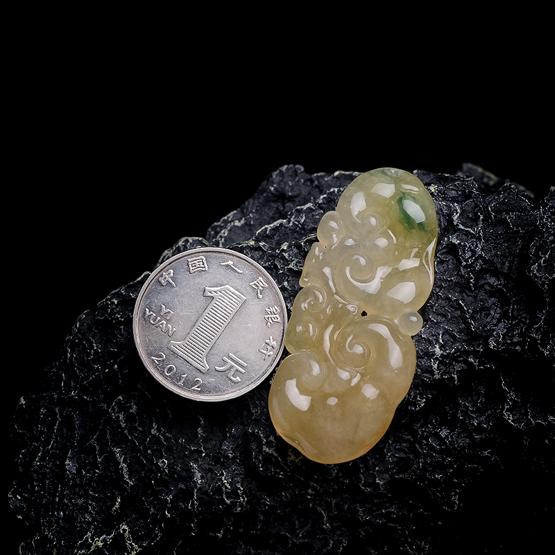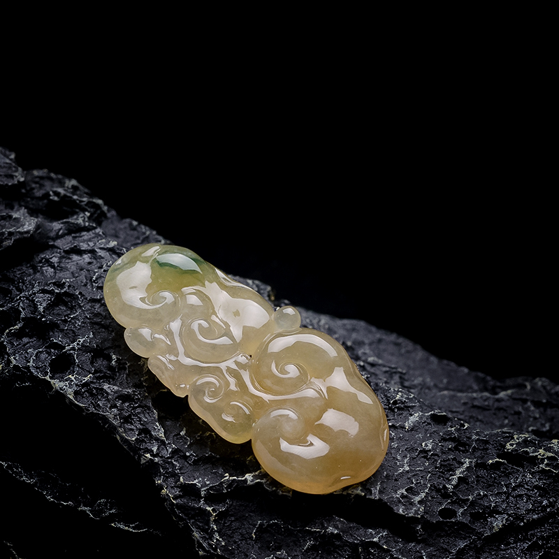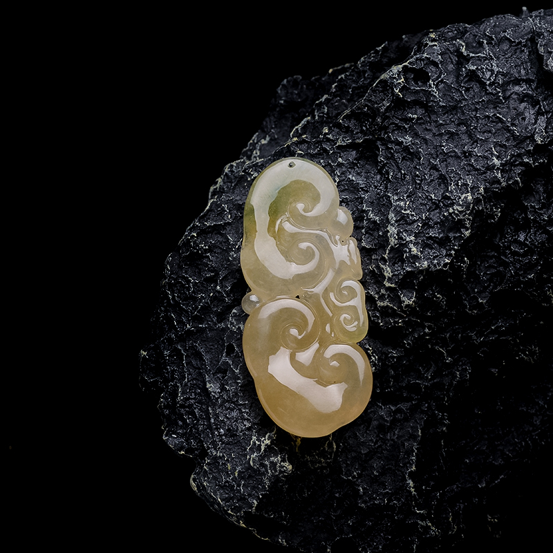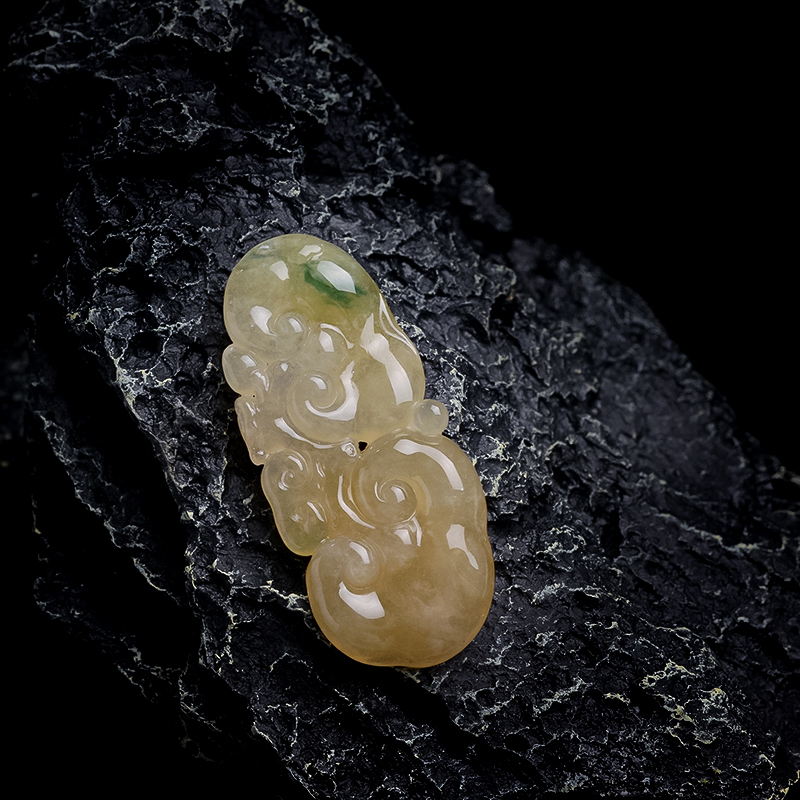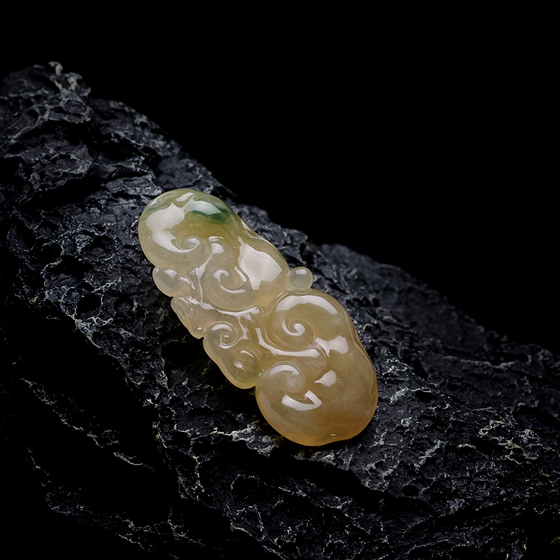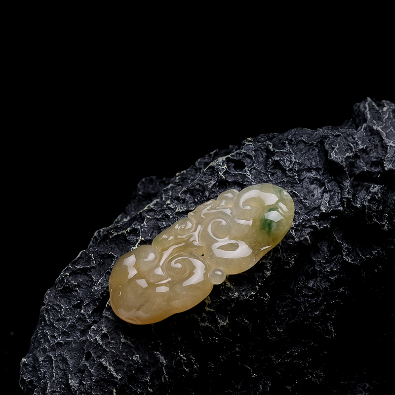 • 糯冰种黄翡翡翠飘花如意吊坠