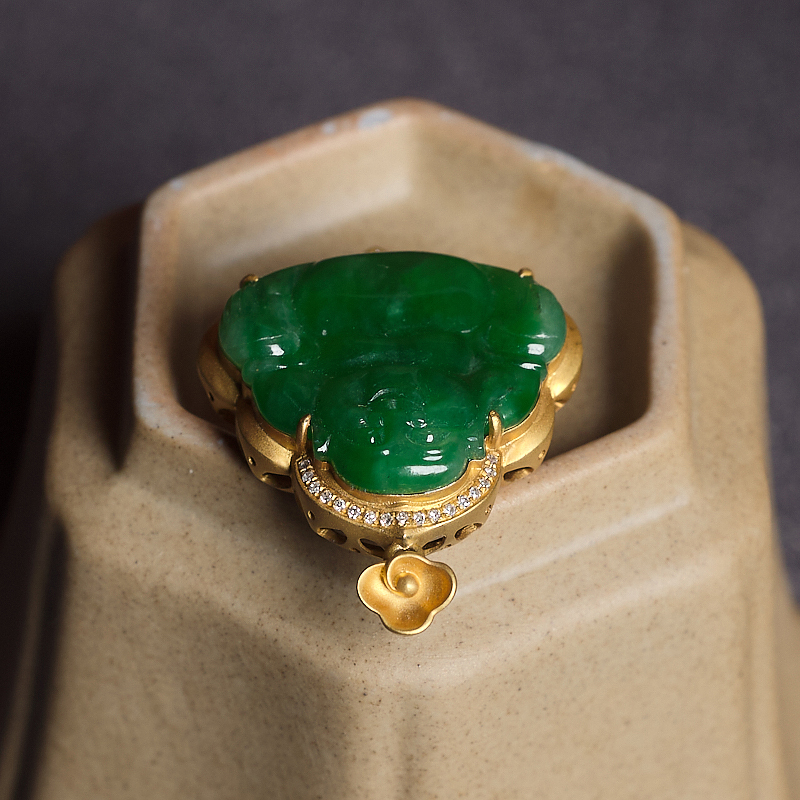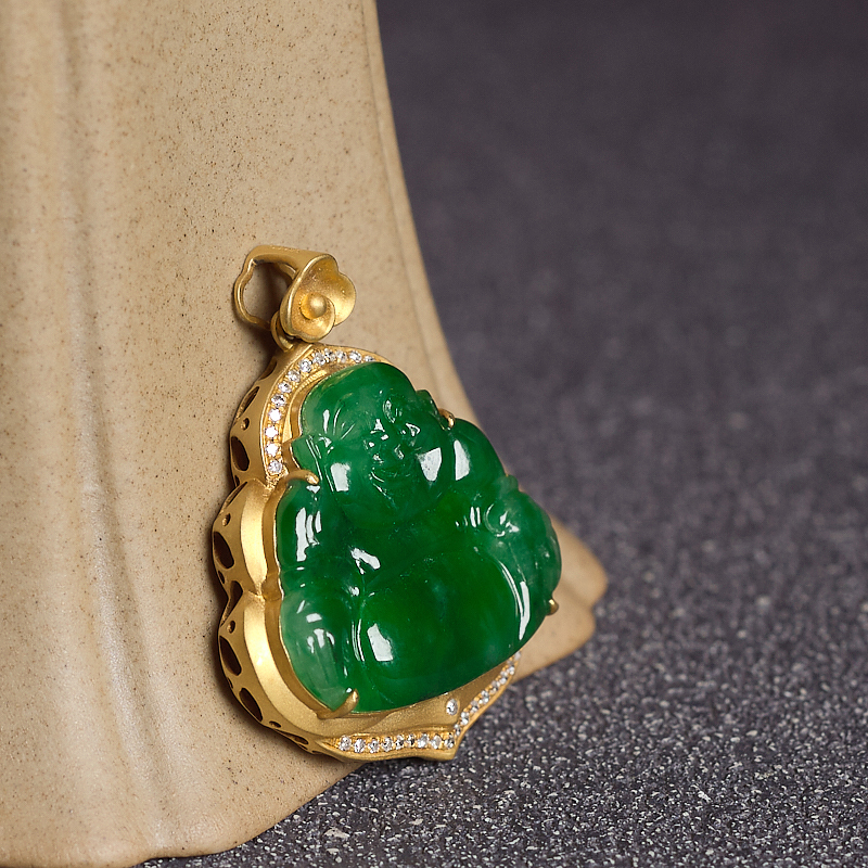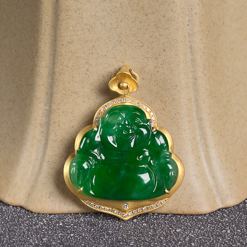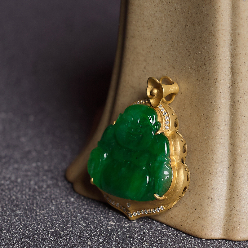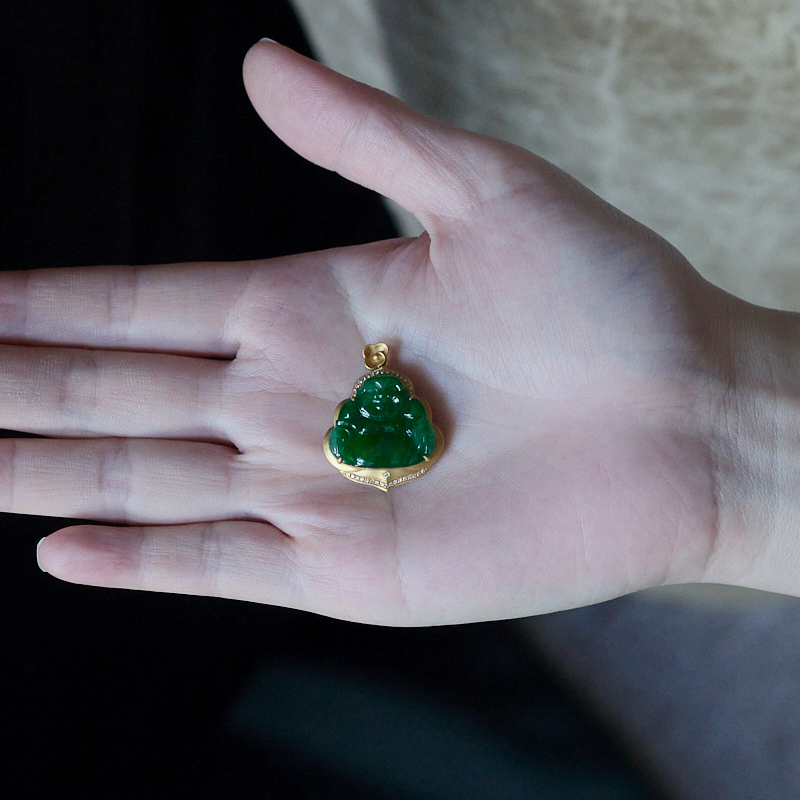 • 18K糯冰种翠绿翡翠弥勒佛吊坠