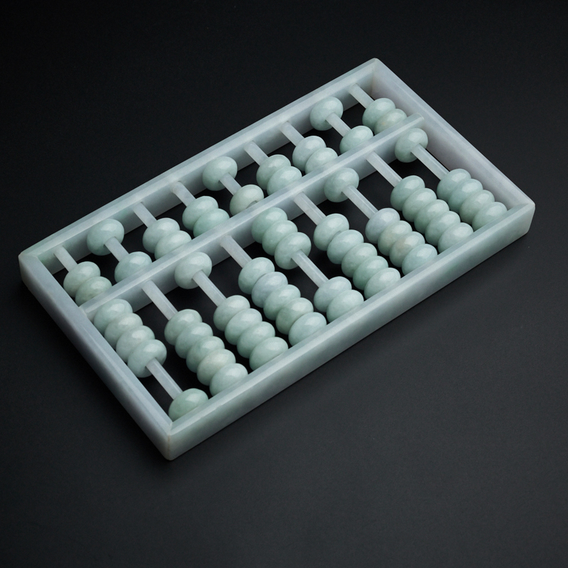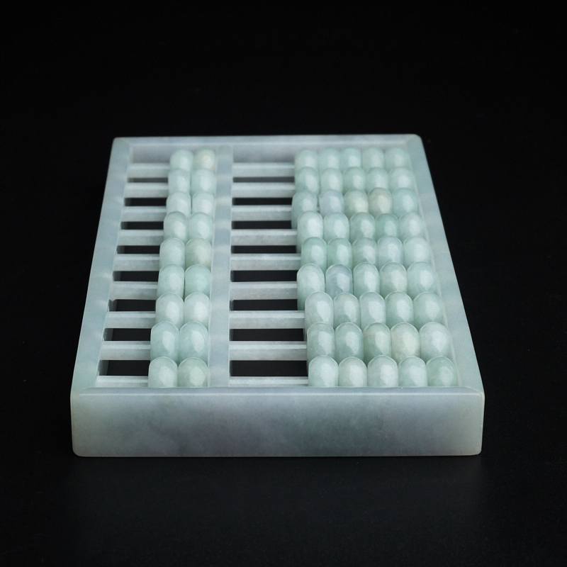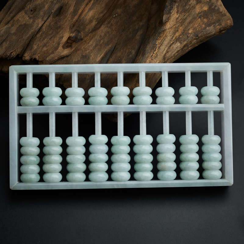 • [产品描述] 糯冰种浅绿翡翠如意算盘摆件,玉质细腻,色泽清幽淡雅。整个算盘由一块原石打磨而成,算珠粒粒圆滑灵动,光洁清新,绝妙无比;框架线条清晰,做工精细,古朴大方。古语云:“算盘一响,黄金万两”,所以翡翠算盘有招财进宝、财源广进的寓意,是财富地位的象征。
