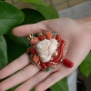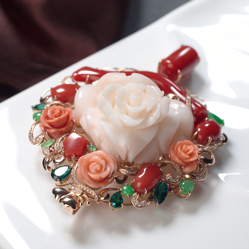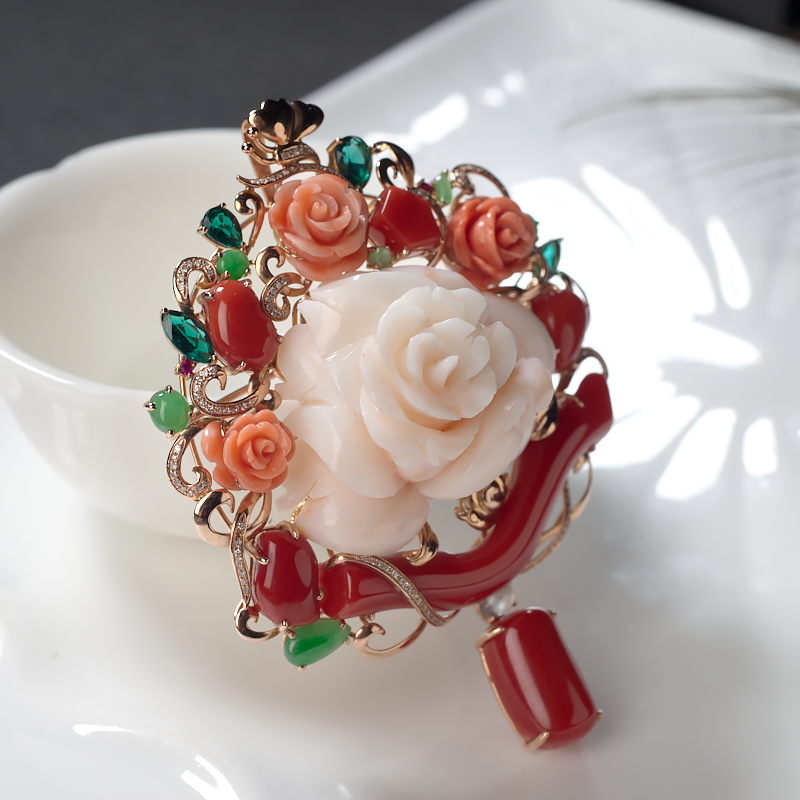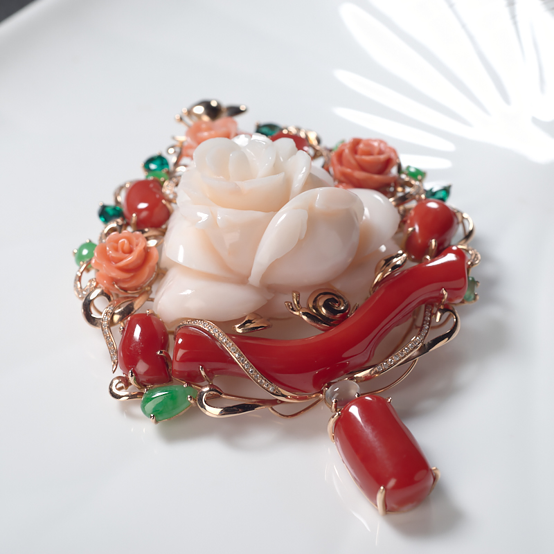• 18K珊瑚玫瑰花吊坠/胸针两用款