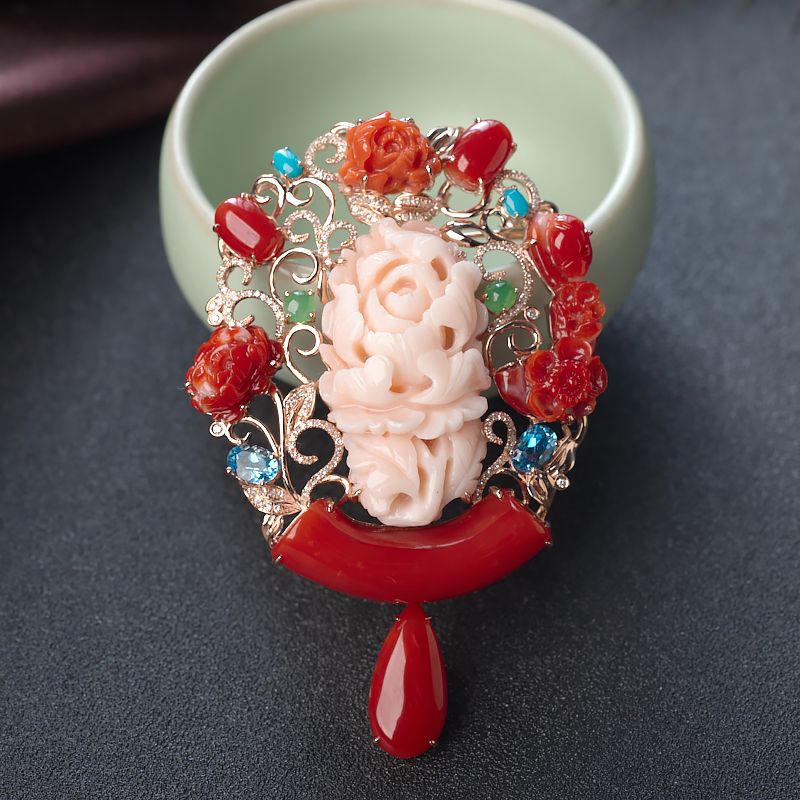 • 18K珊瑚花开富贵吊坠/胸针两用款