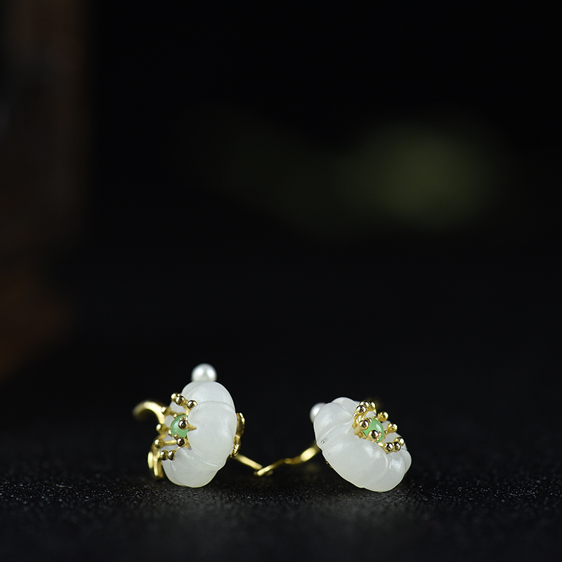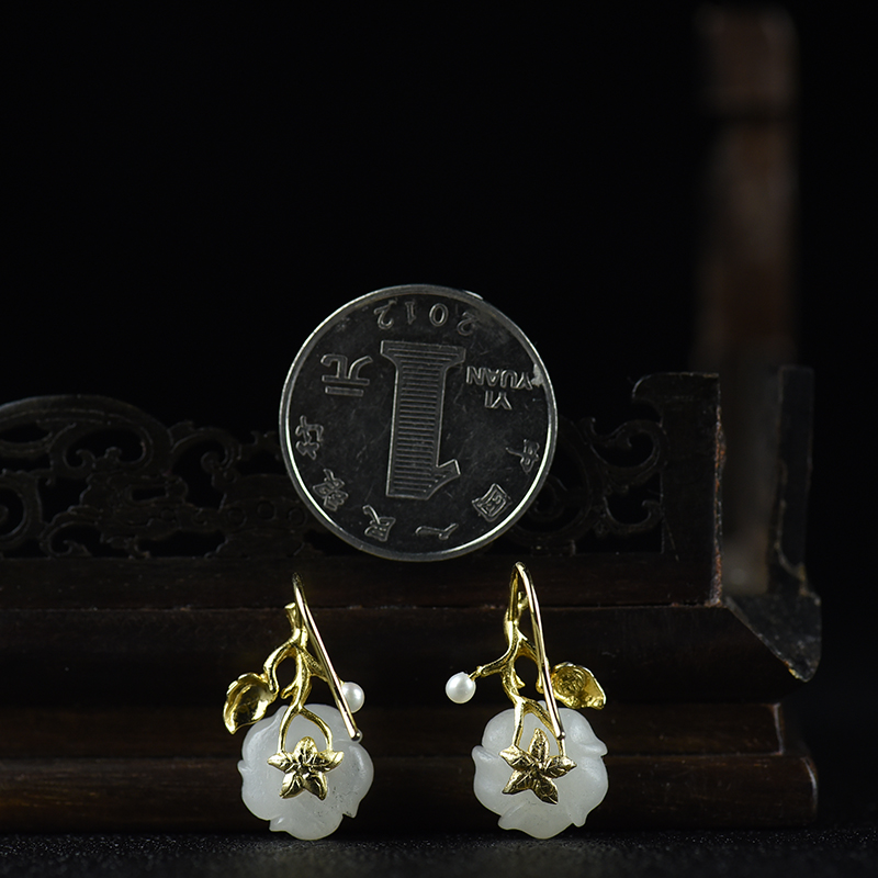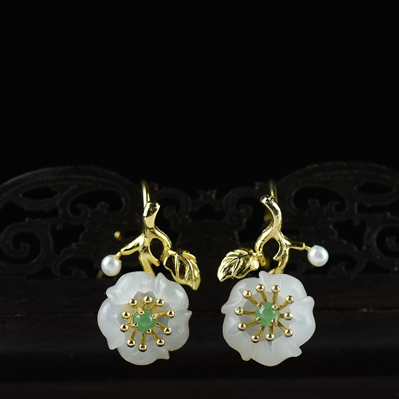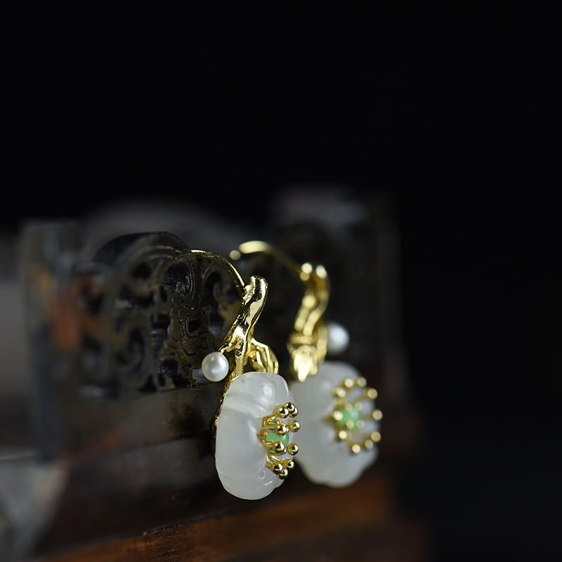 • 银镶山料和田白玉梅花耳坠