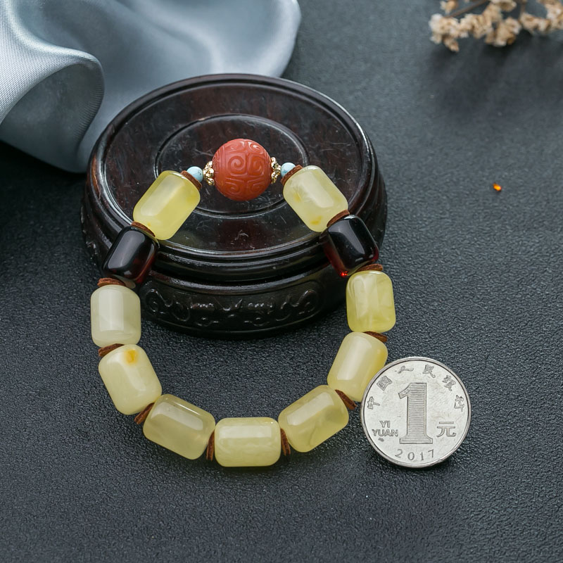 南红珠径14.5mm;全长20cm,蜜蜡珠数9颗