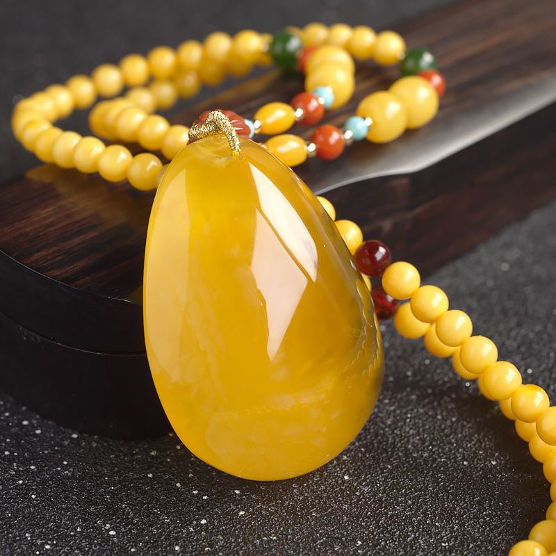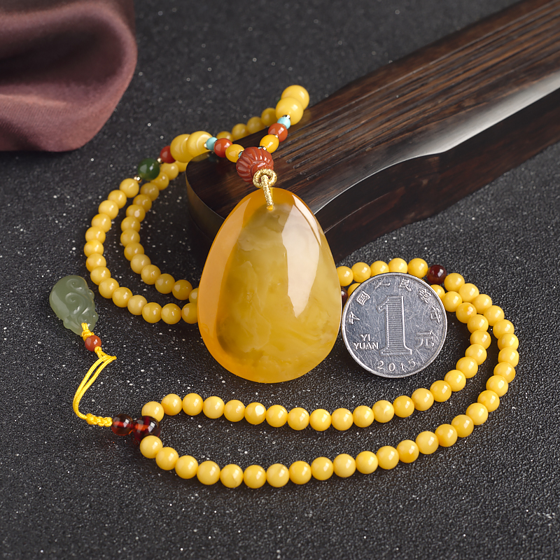 吊坠长45.6mm宽33.6mm厚18.1mm,蜜蜡珠径5mm,
