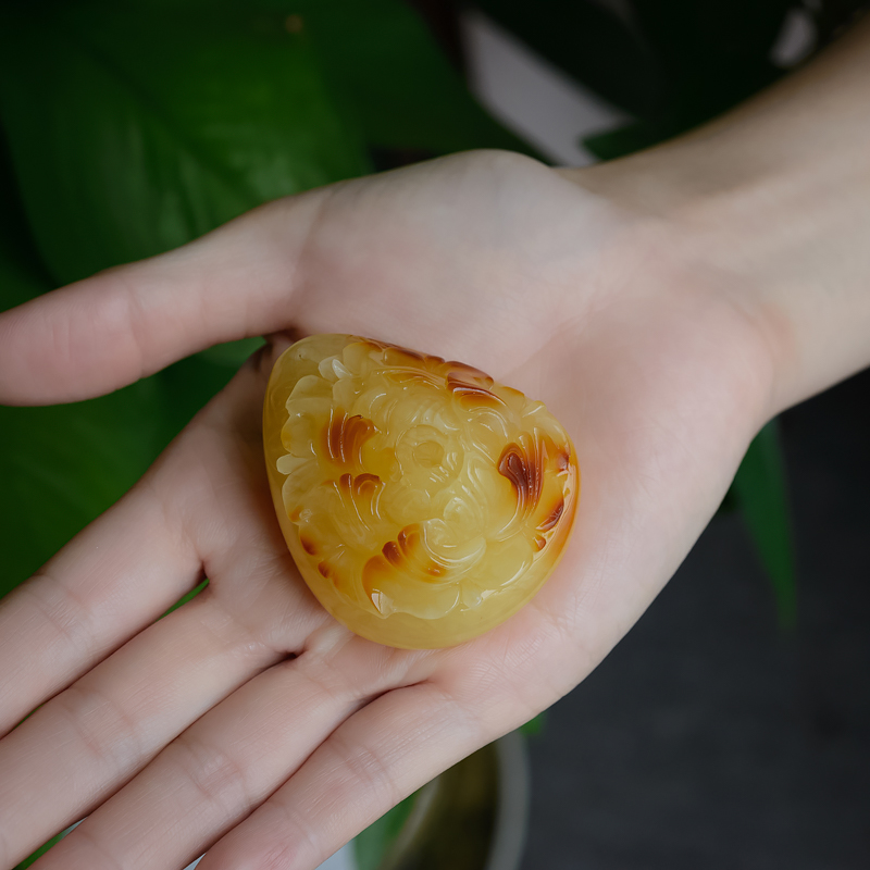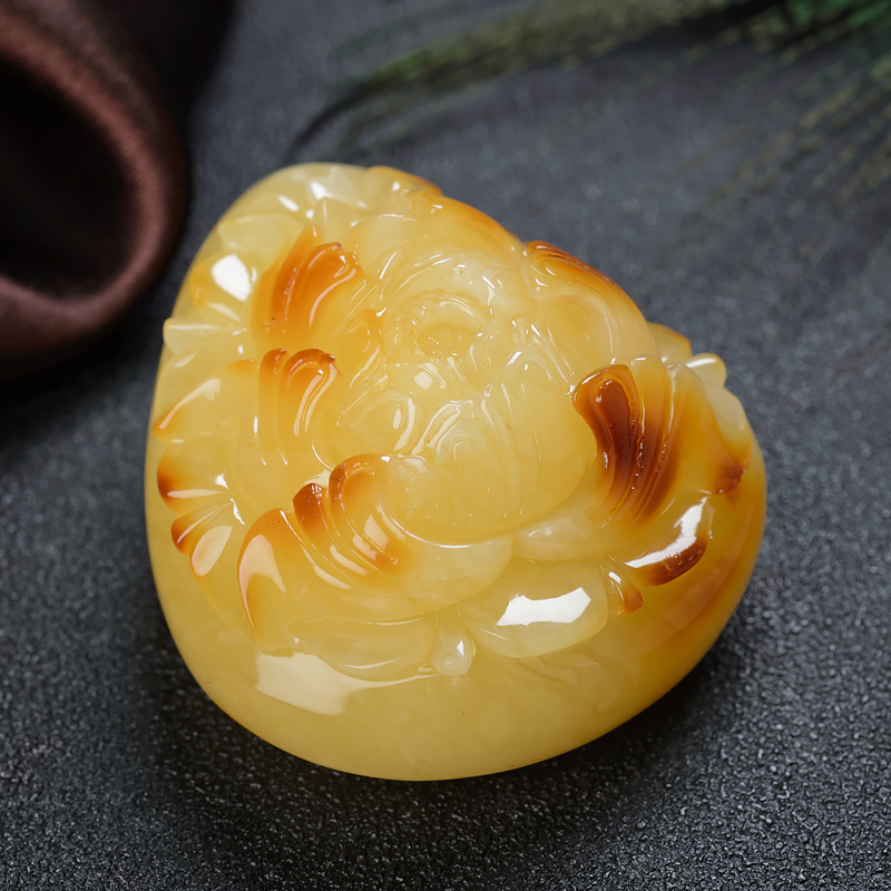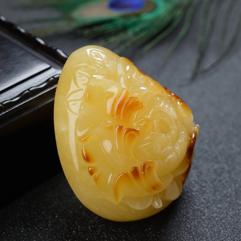 • 带皮鸡油黄蜜蜡牡丹花吊坠
