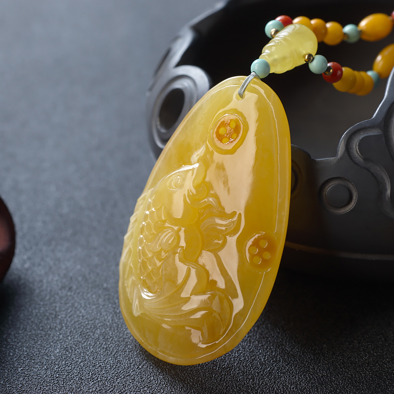 • 带皮鸡油黄蜜蜡鱼牌吊坠