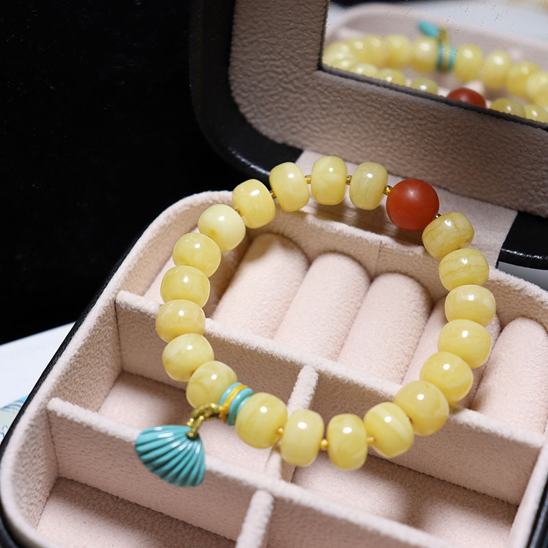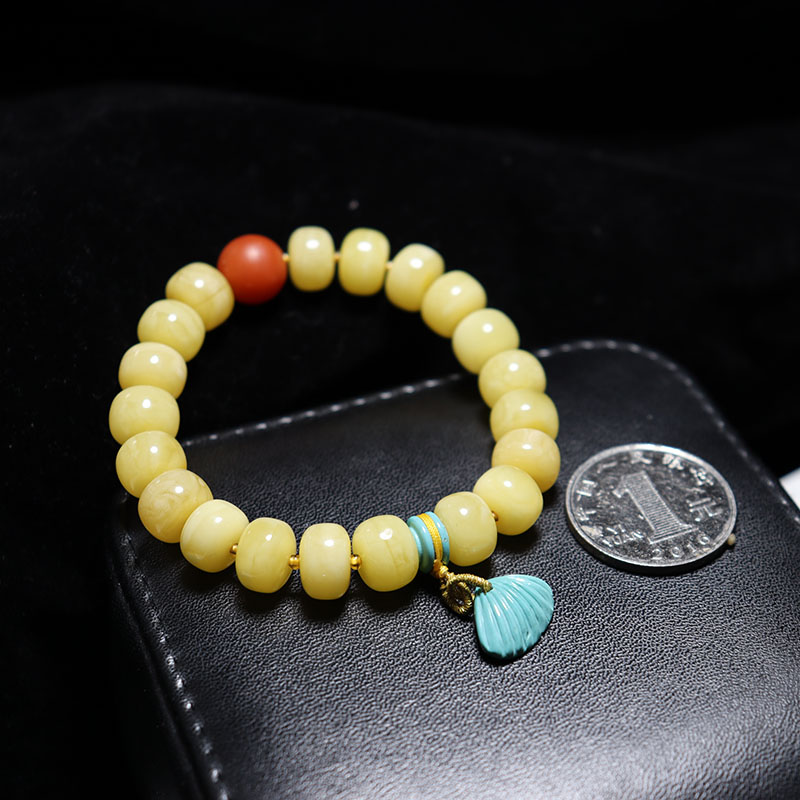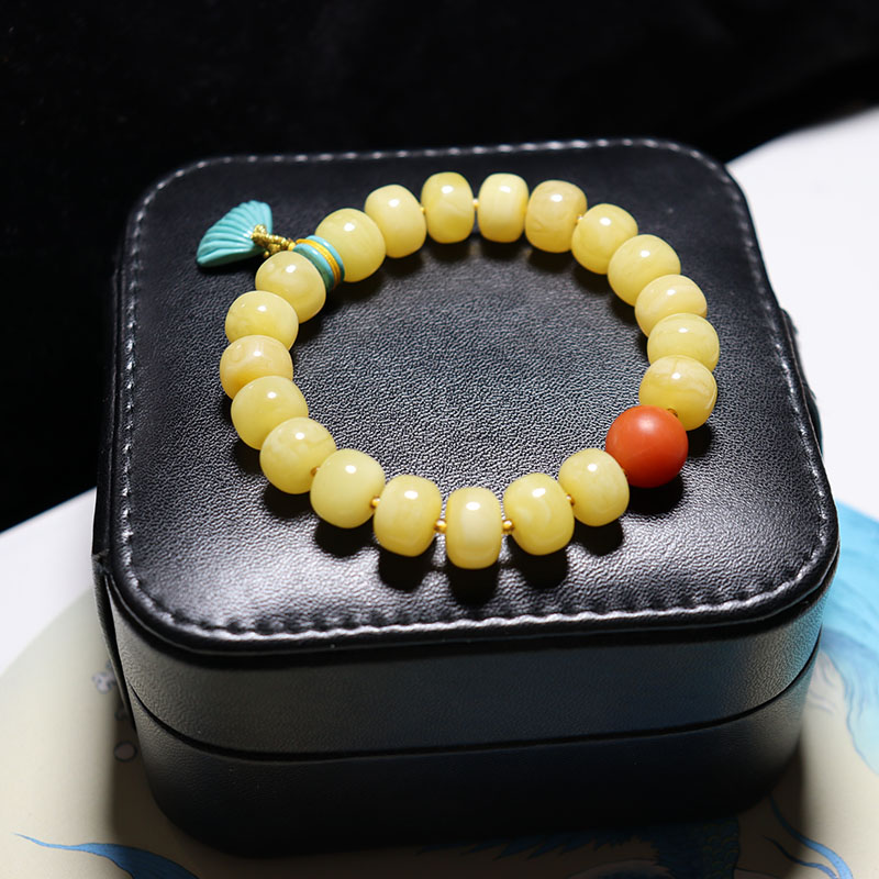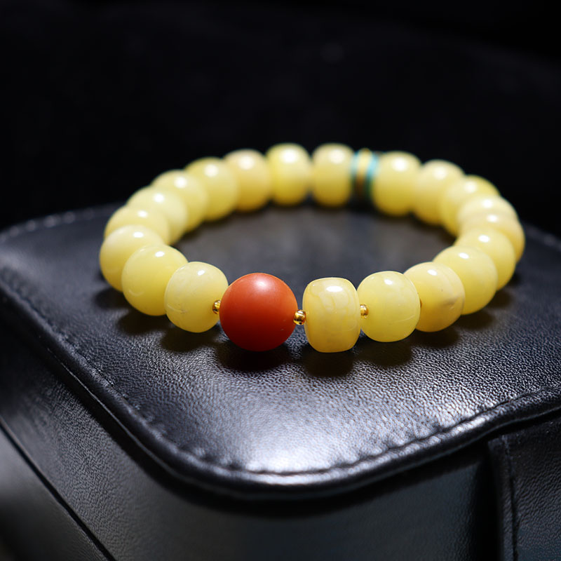 • 10mm鸡油黄蜜蜡老形珠单圈手串