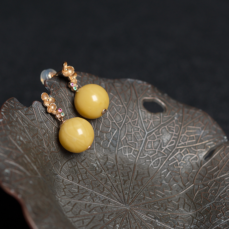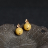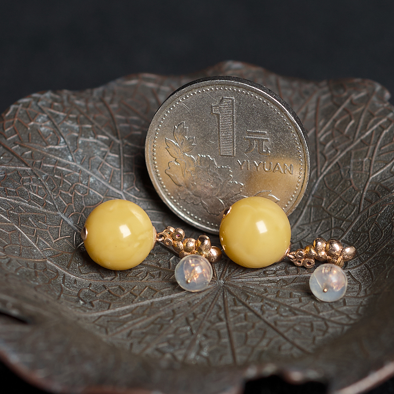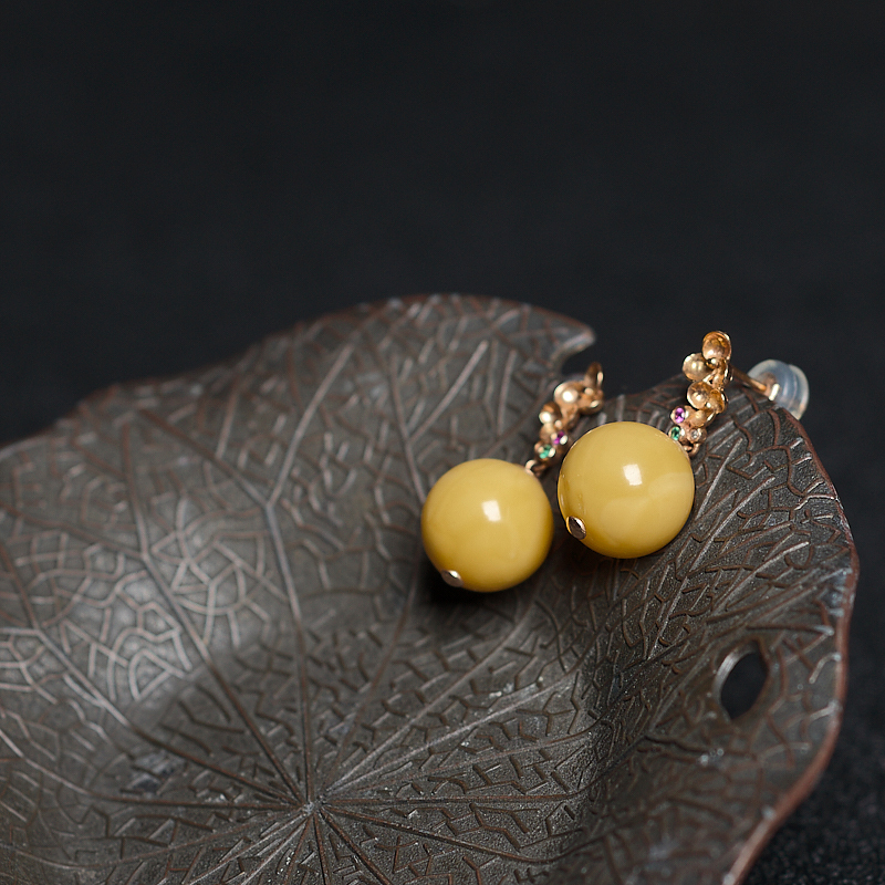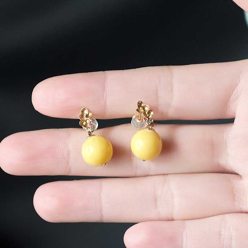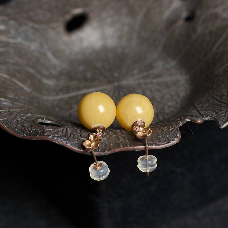• 18K鸡油黄蜜蜡圆珠耳坠