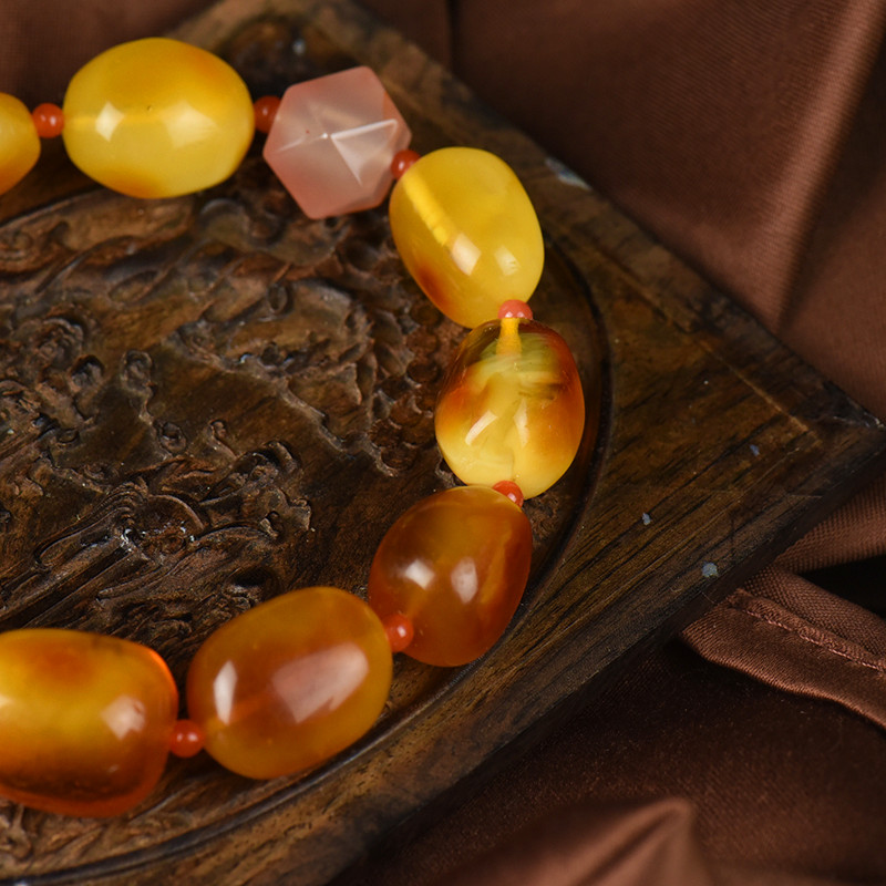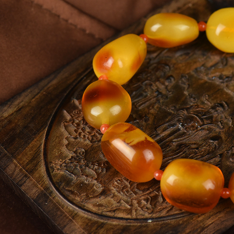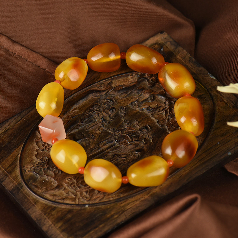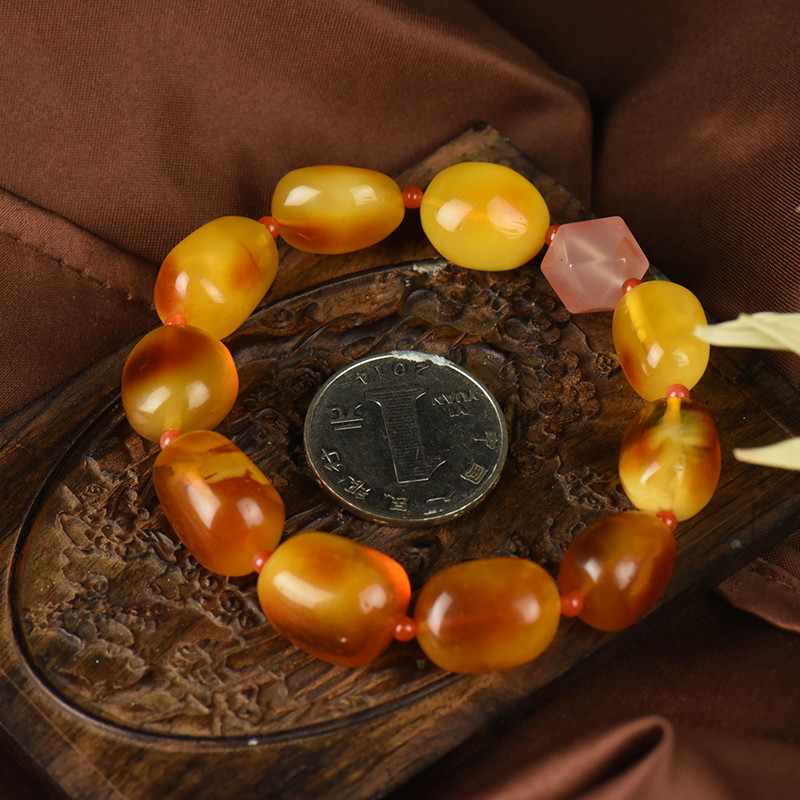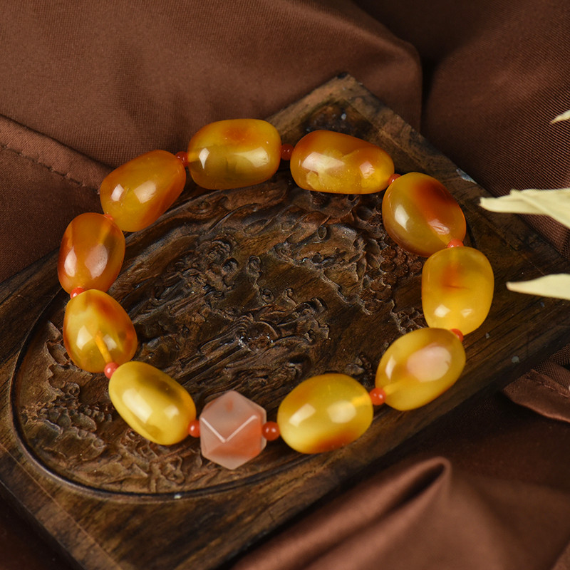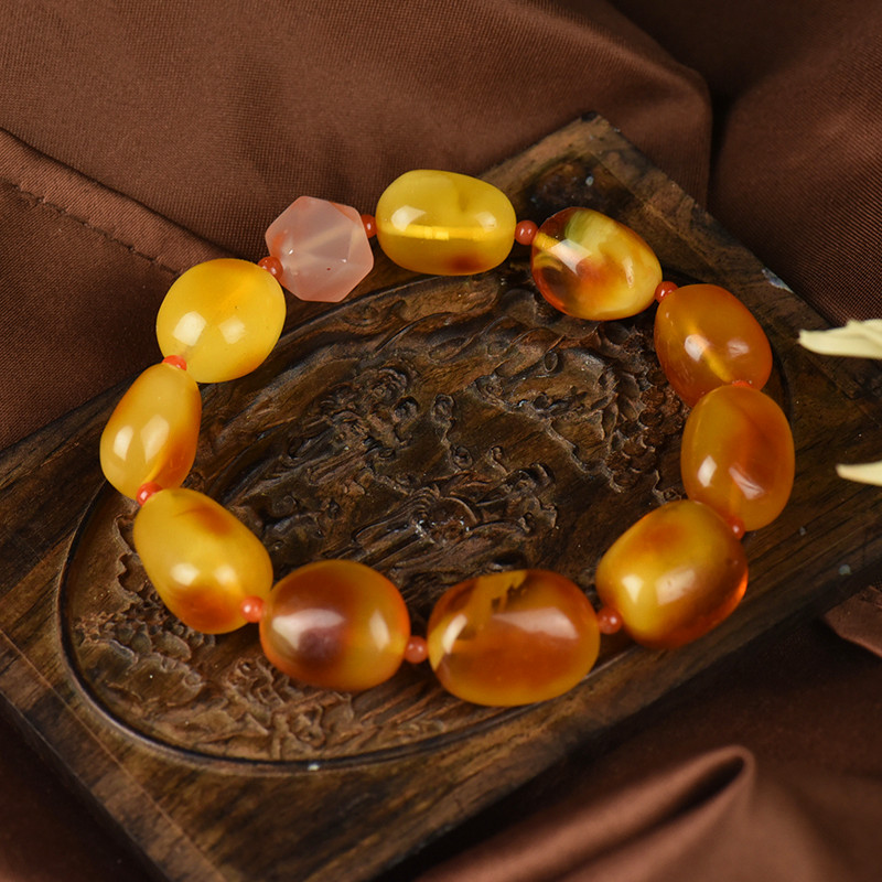 • 带皮鸡油黄蜜蜡随形单圈手串