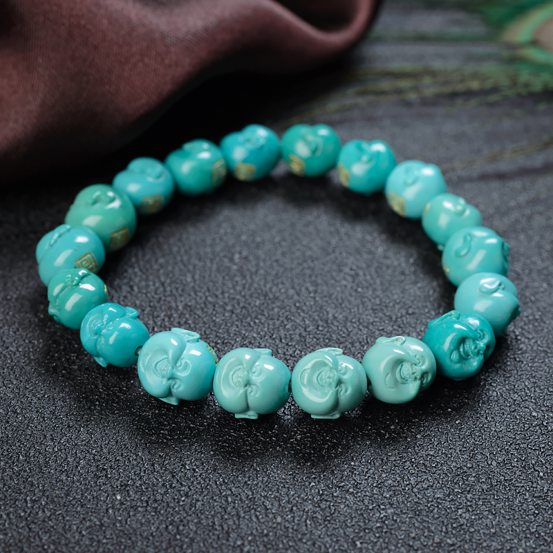 • 中高瓷铁线蓝绿绿松石佛头珠单圈手串