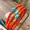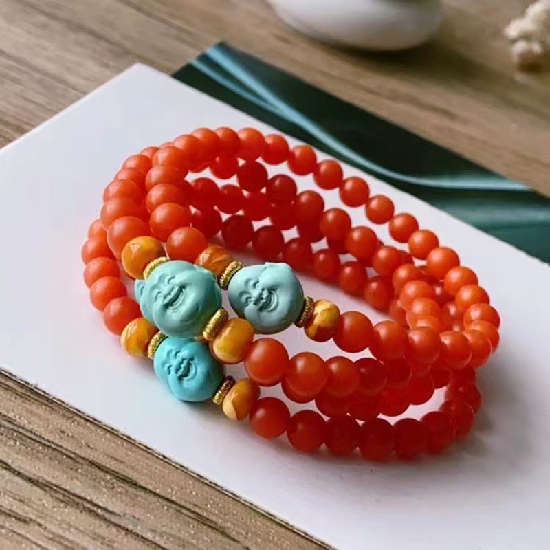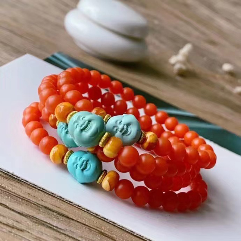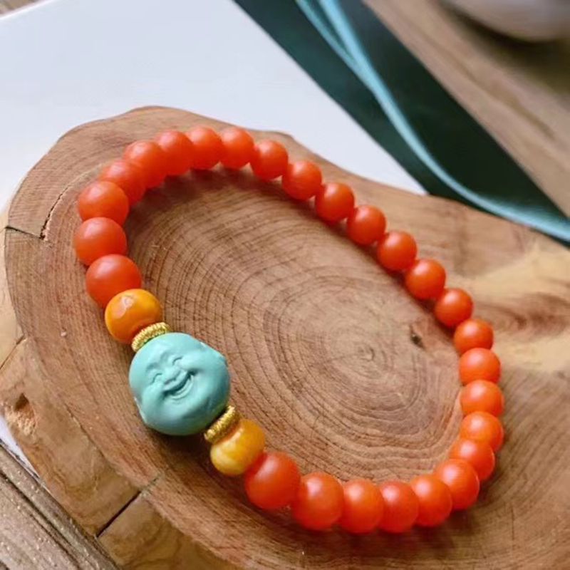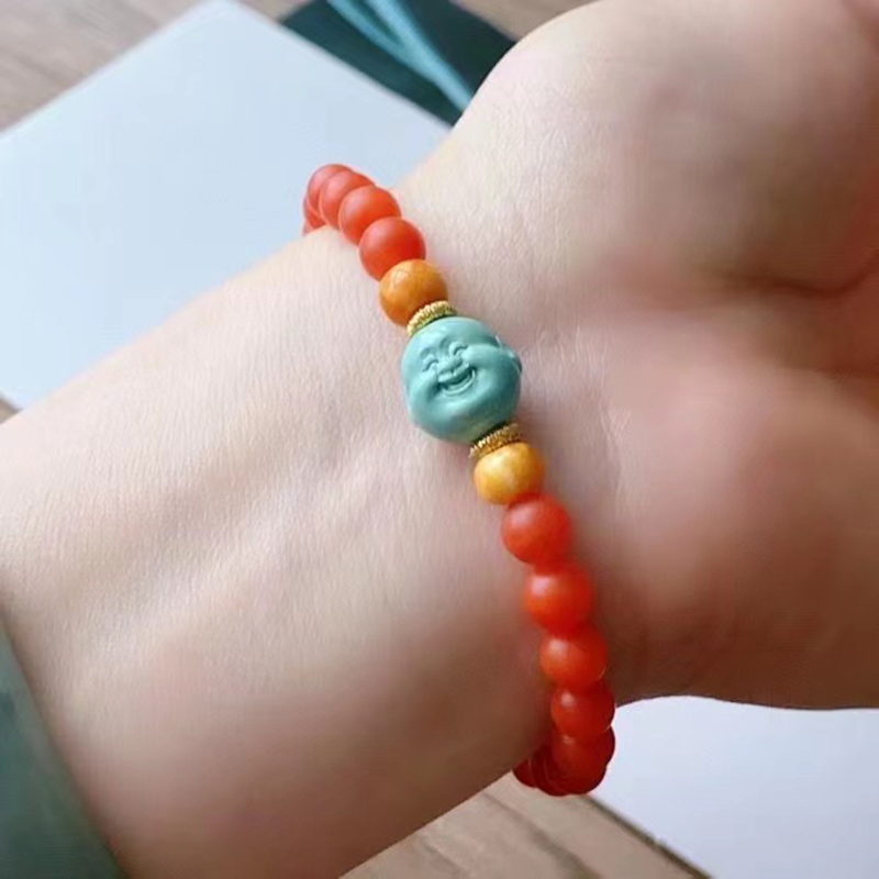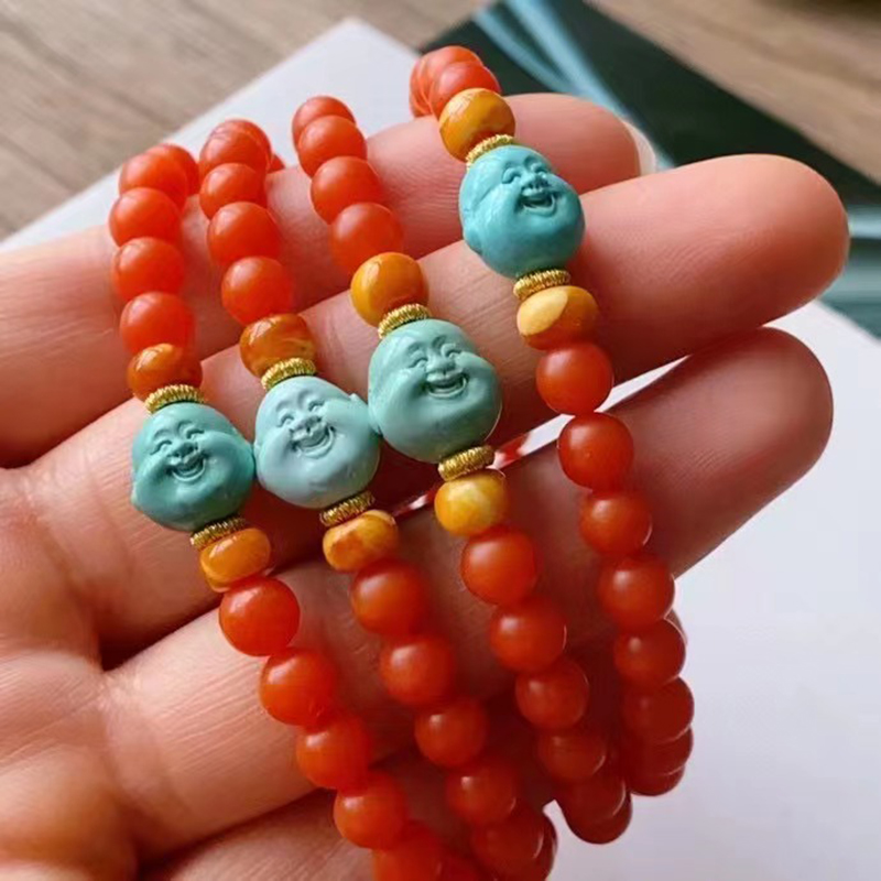 • 高瓷蓝色绿松石弥勒佛单圈手串
