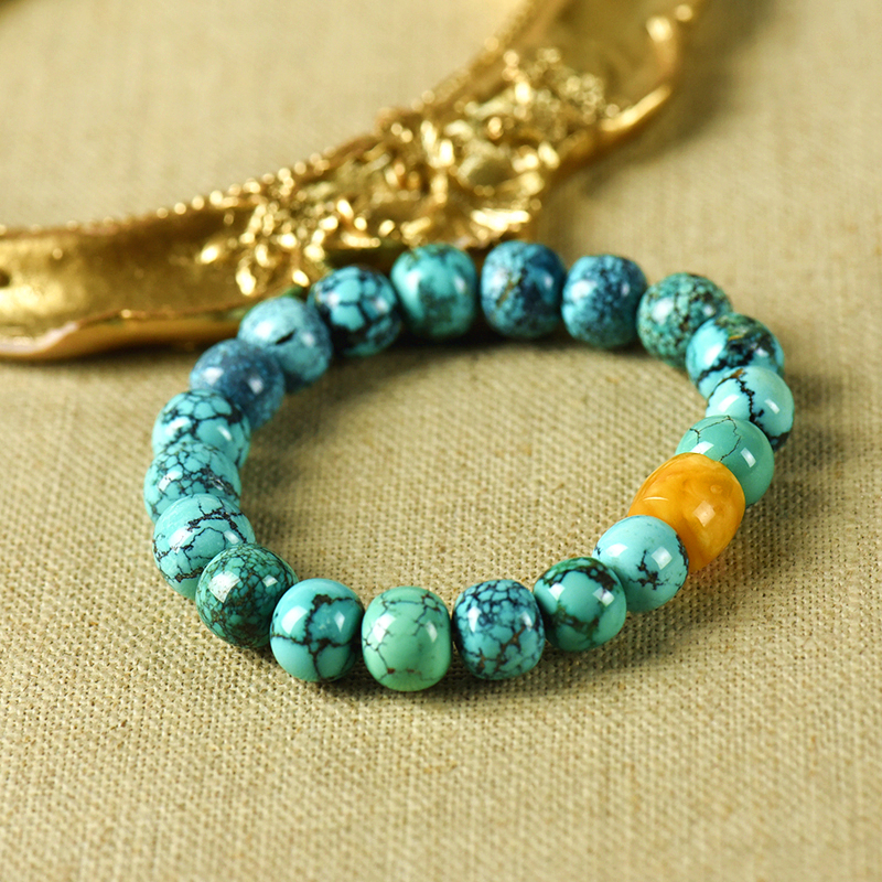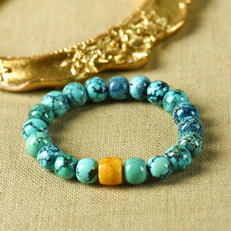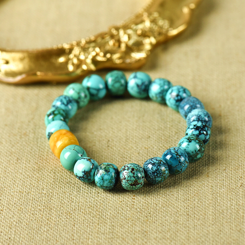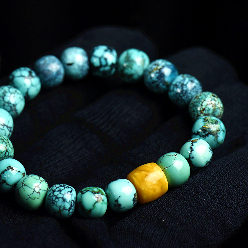 • 中高瓷蓝色绿松石网纹老形珠单圈手串