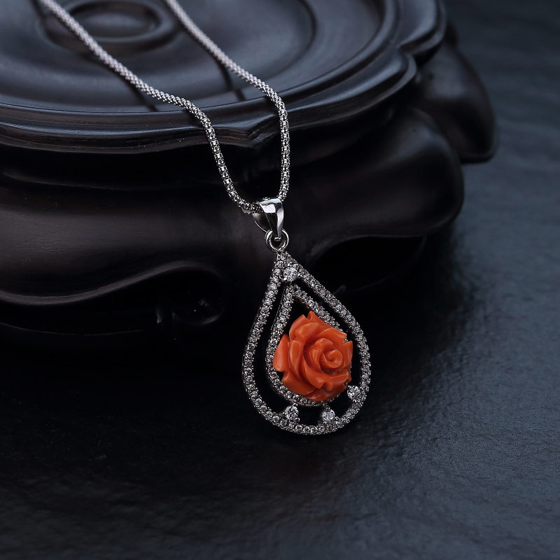 • 银镶天然橘色珊瑚花项链-红掌柜