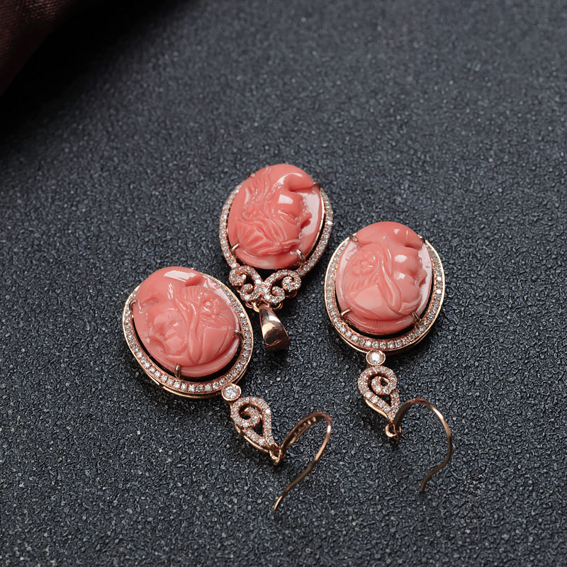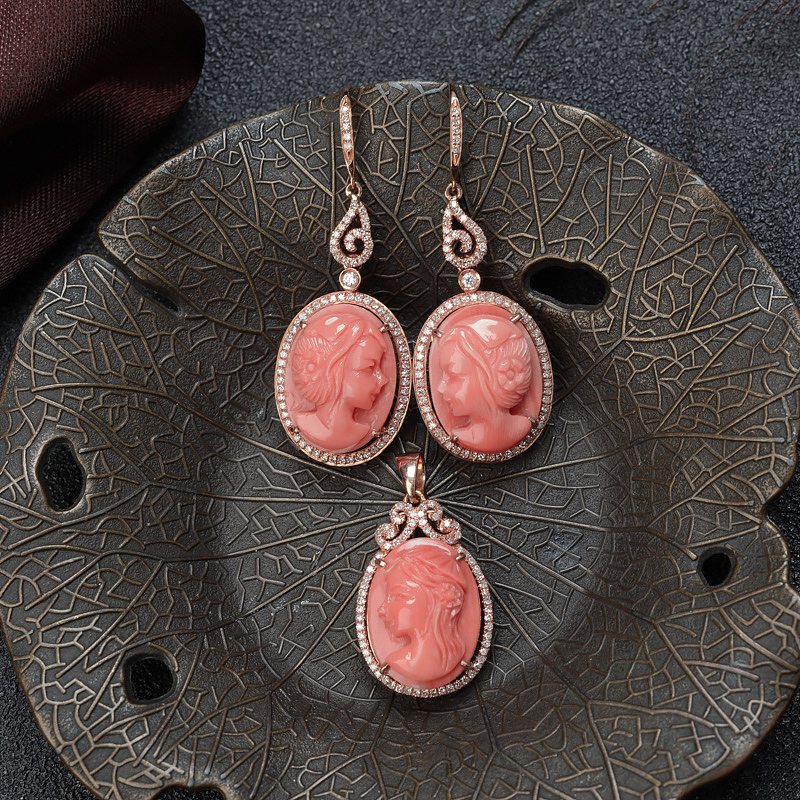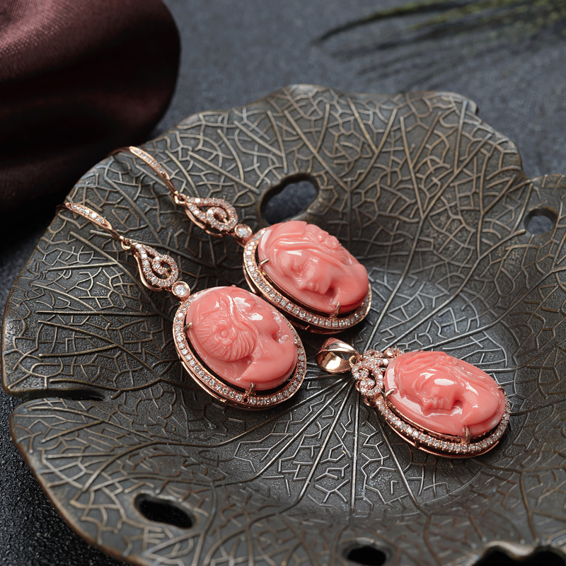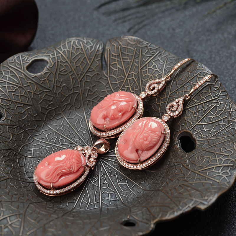 • 18KMOMO珊瑚美女吊坠/耳坠套装